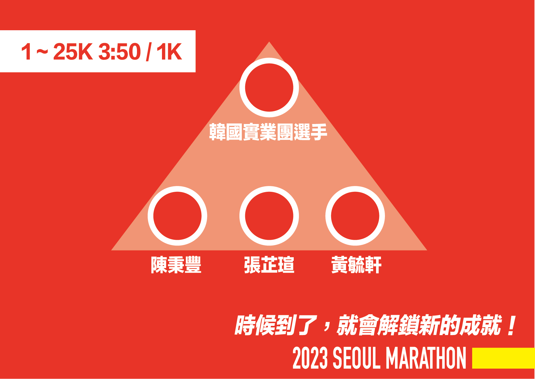 起跑出發後陳秉豐很快狙擊到韓國女子實業團選手,前方有著男子配速員帶領,並對著張芷瑄說:「前方那一群選手,配速看起來是 350( 3 分 50 秒/公里)妳可以評估要不要跟上去!?」張芷瑄剛開始覺得狀況沒有太好,猶豫了一下決定前半馬先拚看看,緊跟著韓國女子選手,陳秉豐和黃毓軒則兩側夾擊陪同,避免有其他選手進入隊伍中擾亂張芷瑄的節奏,就這樣穩穩地跑到半程馬拉松的位置,張芷瑄眼睛瞄向手錶成績 1 小時 20 分多,非常好!這個氣勢就是準備破 PB 態勢,繼續維持住!一路到 25 公里,韓國女子選手的配速員突然退下,換陳秉豐與黃毓軒領頭,到了 29 公里時黃毓軒因身體不適而脫離隊伍,在 2023 東京馬拉松創下 2 小時 38 分人生初馬的黃毓軒,不到二週時間來到首爾協助張芷瑄,身體尚未完全恢復情況下陪伴到此已經非常不簡單。