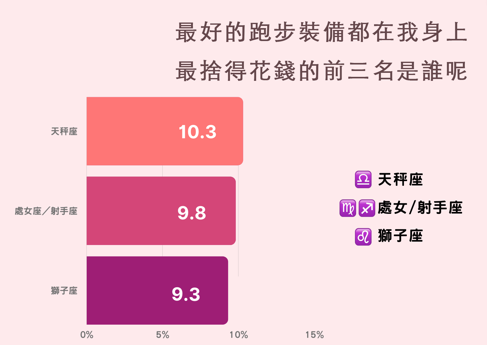 亞軍則由處女和射手座並排,比率都佔了 9.8% 。 射手座不愛計較的個性,對於花錢也是佛系看待,可以說是有錢就用,沒錢就賺,賺了錢就是要花,不會為了省錢而省之儉用,因此對於在消費上是非常大方、不手軟。而處女座們大多數的情況下是有分寸的,不過他們對於品質的要求極高,使用的東西也一定是要選擇最好的,所以他們買的跑鞋可能不多,但價格通常都偏高。