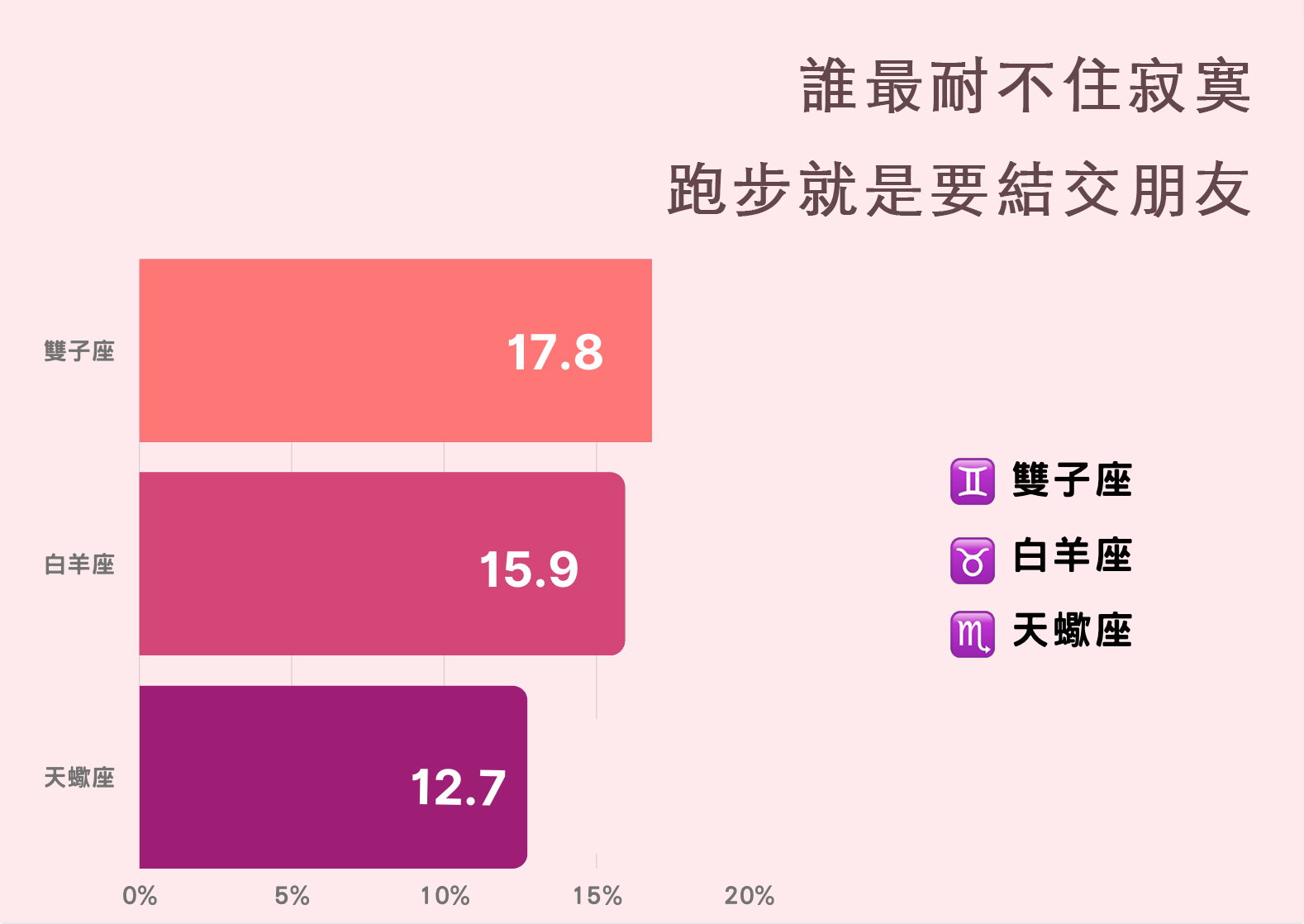 第二名為白羊座,因為結交朋友而跑步的比率佔了 15.9%,談起白羊座很多人會直接聯想到衝動,甚至會說他們是個性「火爆」的人;不過真正認識他們以後,會發現他們其實一點也不容易生氣,只是看似活得開朗和灑脫的背後,其實內心承受著很多情緒,漸漸地活成了「最孤獨」的星座,不喜歡一個人待在家裡被孤單吞噬的他們,到戶外去活動跑步,自然而然就成了他們的首選之一。