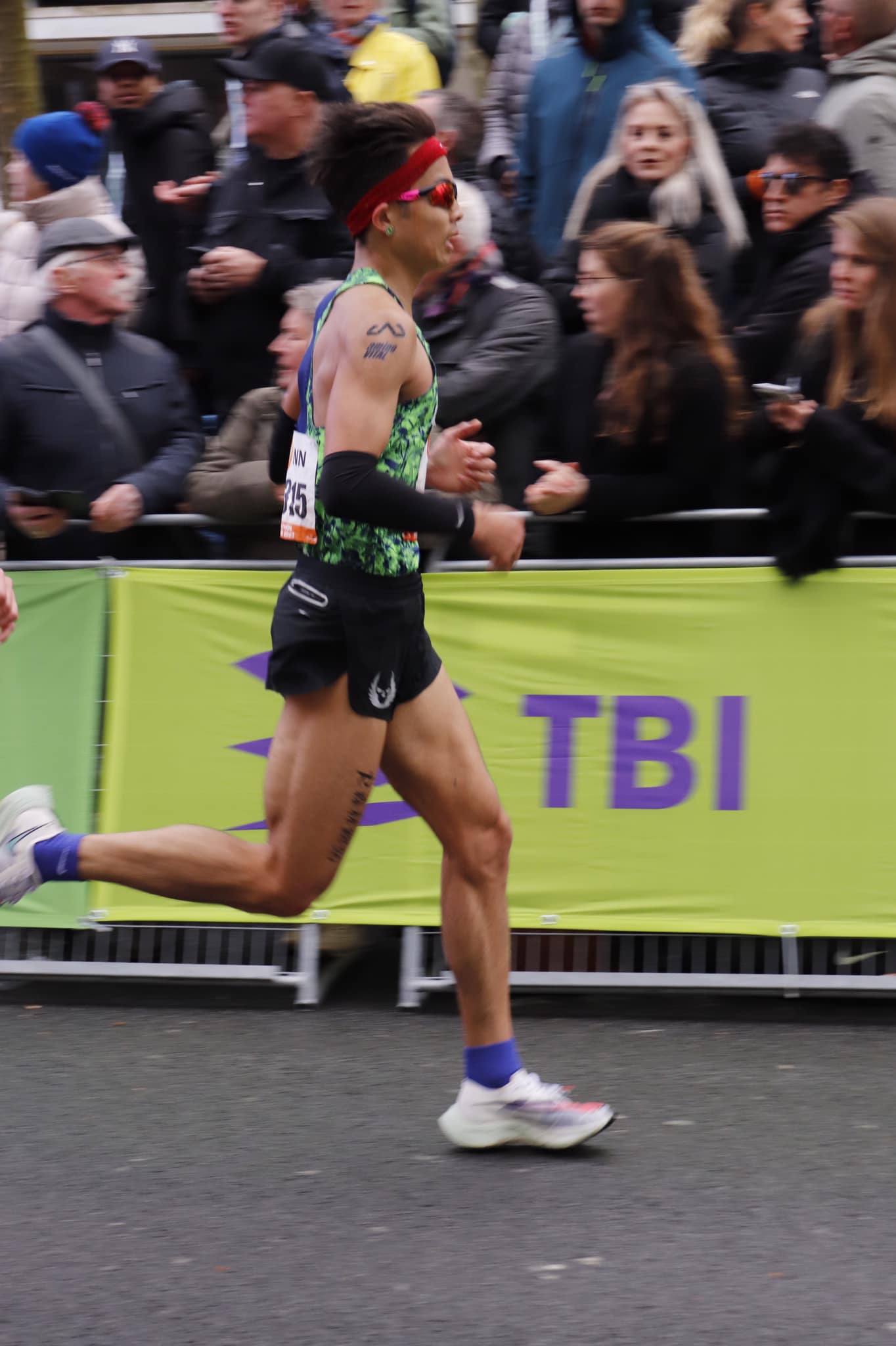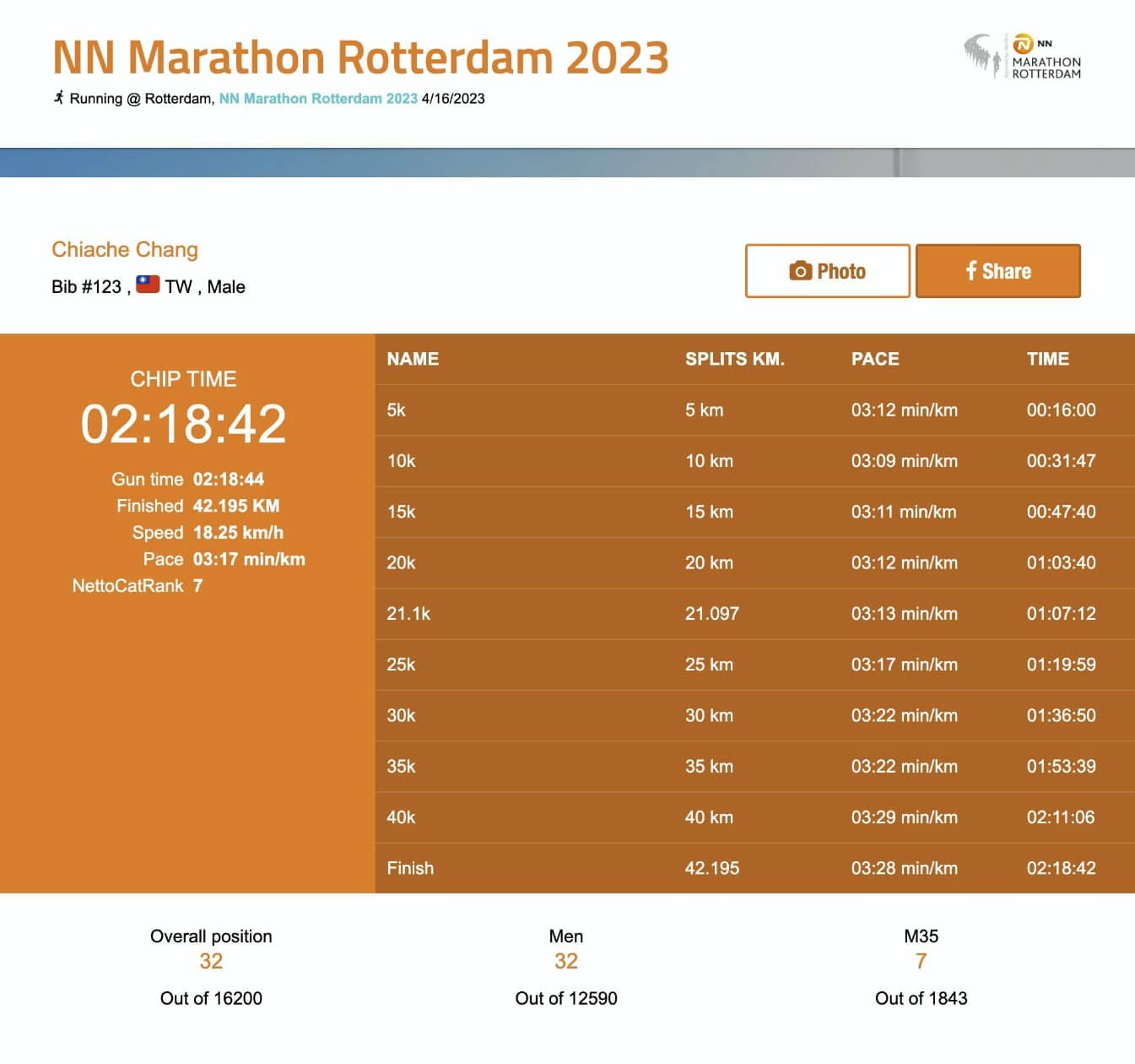 和曹純玉一起飛往鹿特丹參賽的最速古人陳囿任而則跑出 02:33:55,排名第 168 位。他說:「前半馬地勢也是有上有下,但因為風勢不大,加上集團尚未瓦解,因此很好跑,持續穩定在 229 的配速,不過後半馬,風勢逐漸轉強,逆風段較多,30 公里後開始繞行凱拉琳珍湖園區,不但緩長上坡居多,且風勢越發強勁,集團開始各自單飛。最終,前半馬 74 分 40 多秒,後半馬 79 分 0 幾秒,已經不知道有多久沒有爆這麼多了。」