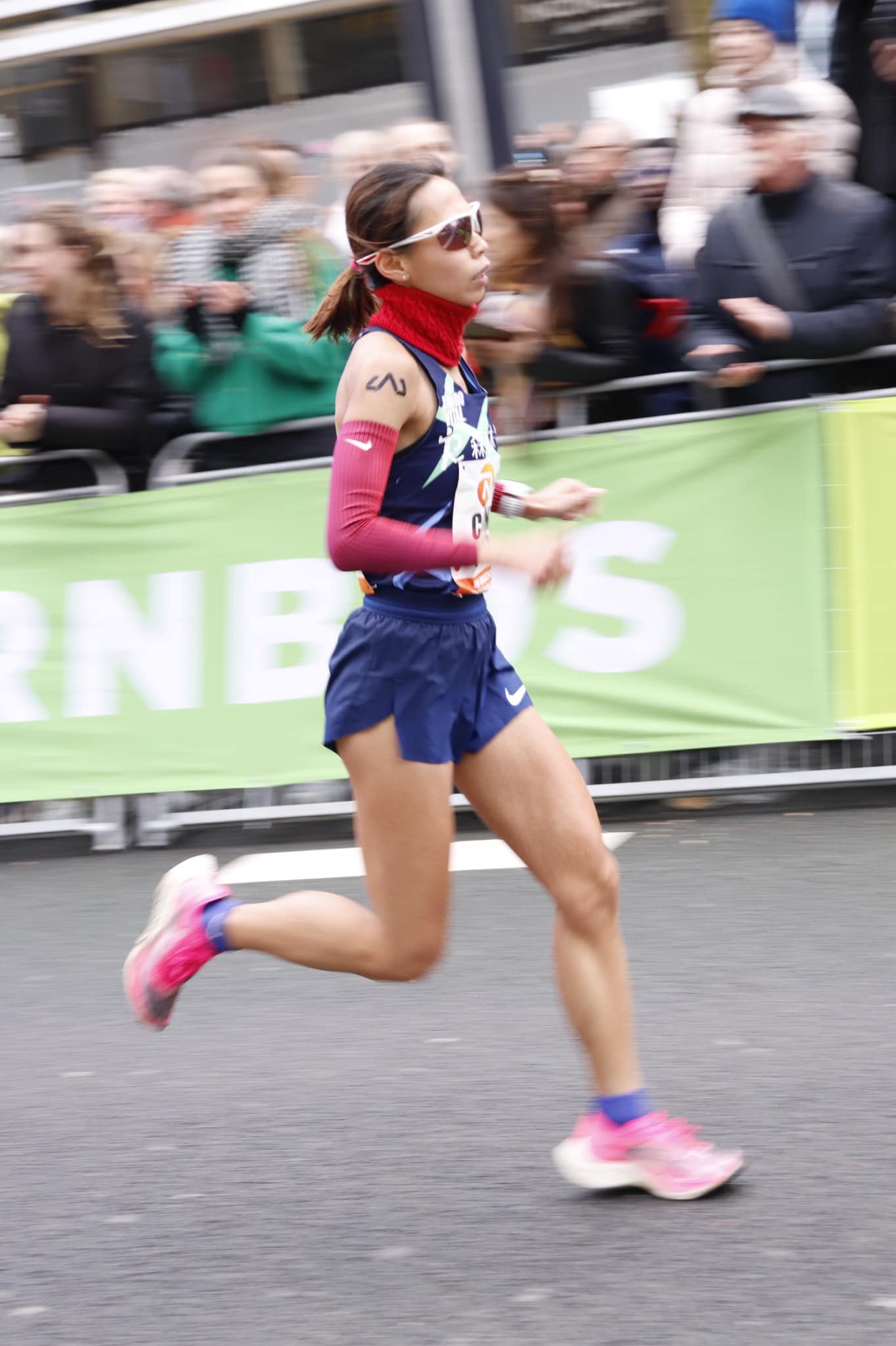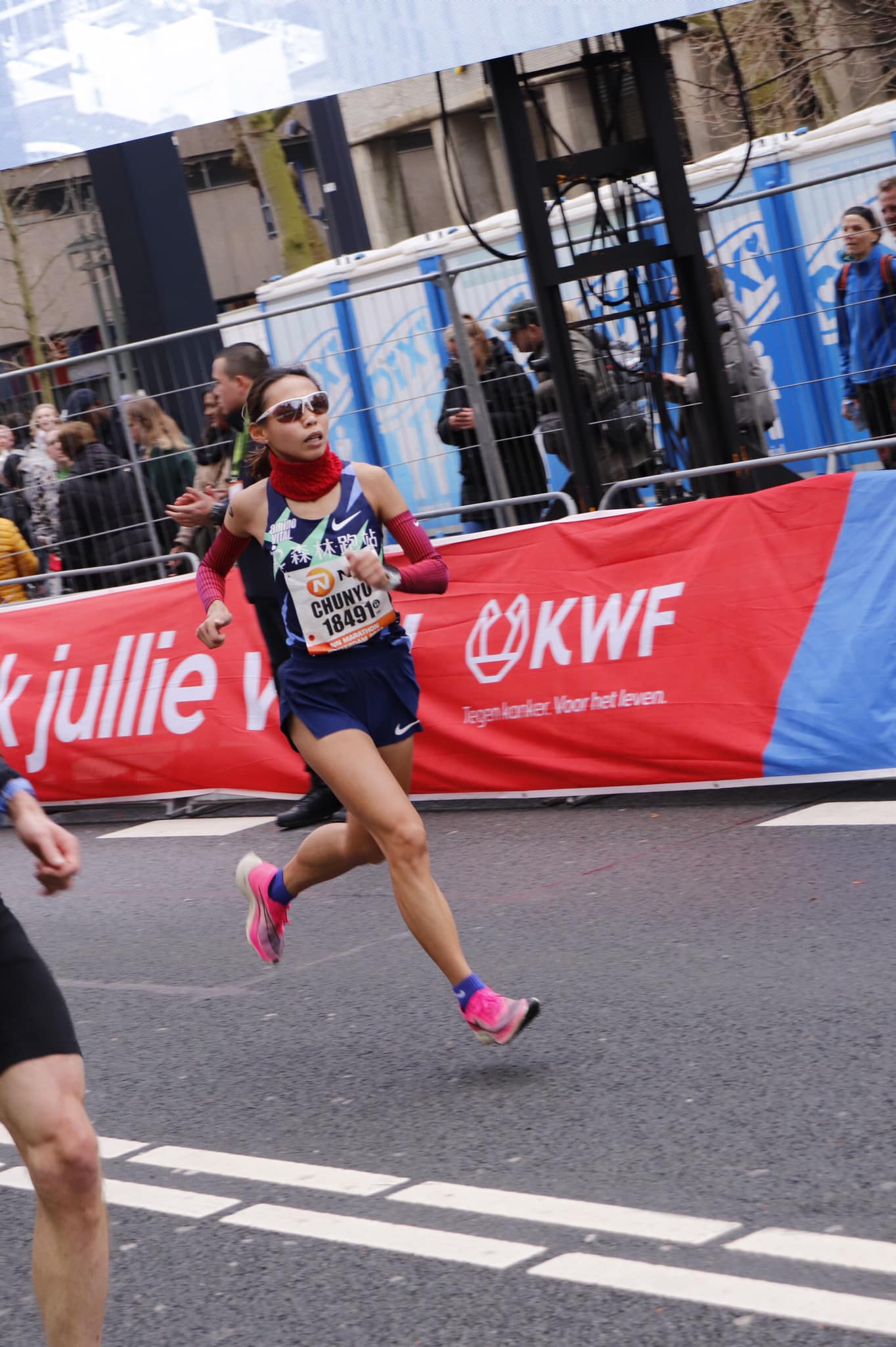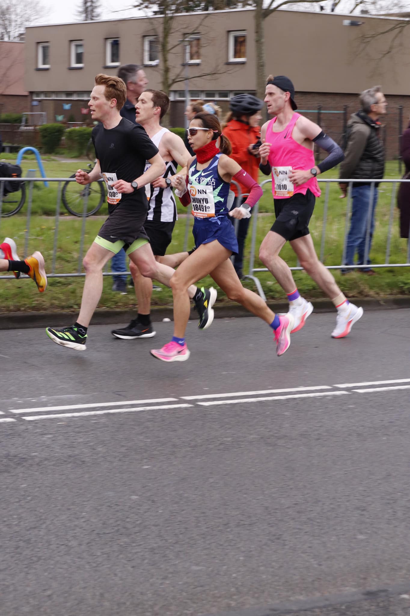 約莫到 34 公里左右曹純玉經過一個超大的螢幕,聽到熟悉的中文,是森跑老闆娘和小幫手的加油聲!當下她整個精神都來了,不過隨之而來的卻是賽道的魔王關卡,於 Kralingen 湖那邊有一段很長的上坡,還有逆風,加上原本的歐洲男生早已分散,沒有人可以幫忙擋風,導致曹純玉的速度開始慢慢往下掉, 37 公里時配速已經掉到 3 分 50 幾秒。
