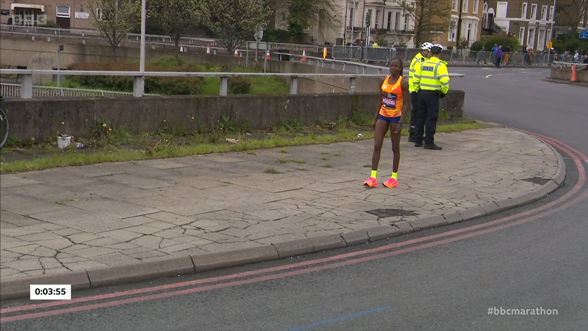 不得不說今年倫敦馬選手的狀況真的很多,就在比賽時間來到 1:01:30 接近 20K 左右時, Sifan Hassan 腿部似乎也出現了狀況,她趕緊停下進行了伸展,並且還進行了兩次,就當大家以為她即將要放棄時,她再度回到賽道進行奮戰,不過這個伸展也讓她與集團距離拉開了約 10 秒鐘。