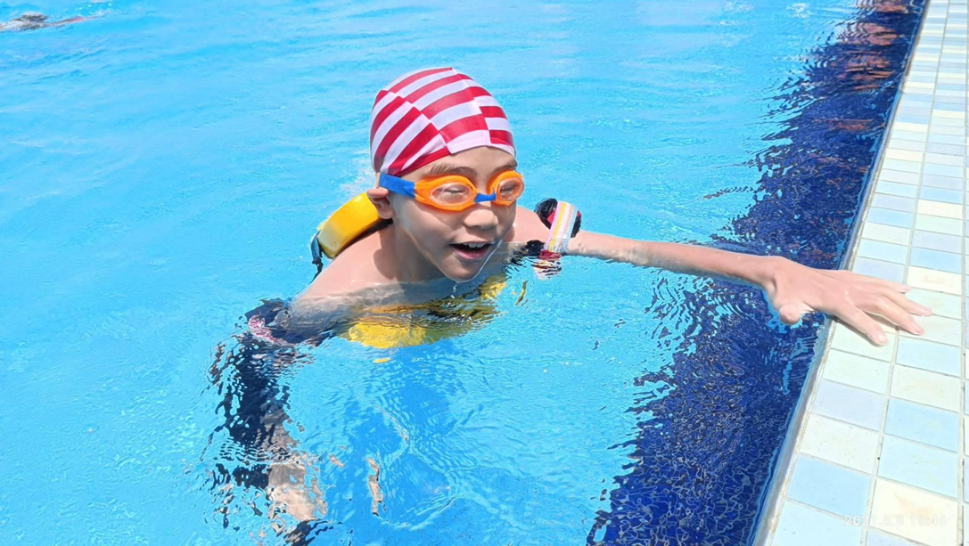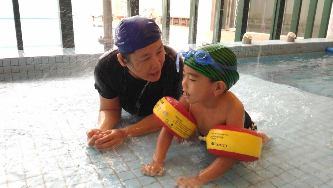 起初泉泉在水中因為無法觸地顯得相當不安,然而在爸爸的陪伴及教練的指導下,慢慢的能在水中踢踢腿、伸展肌肉,現在甚至還進步到能在水中游泳,就算被水嗆到仍能勇敢的繼續動作,更重要的是,泉泉不用被身體張力受限住,反而能依照自己的意志自由地玩耍,開開心心在水中做一隻自由的小飛魚。