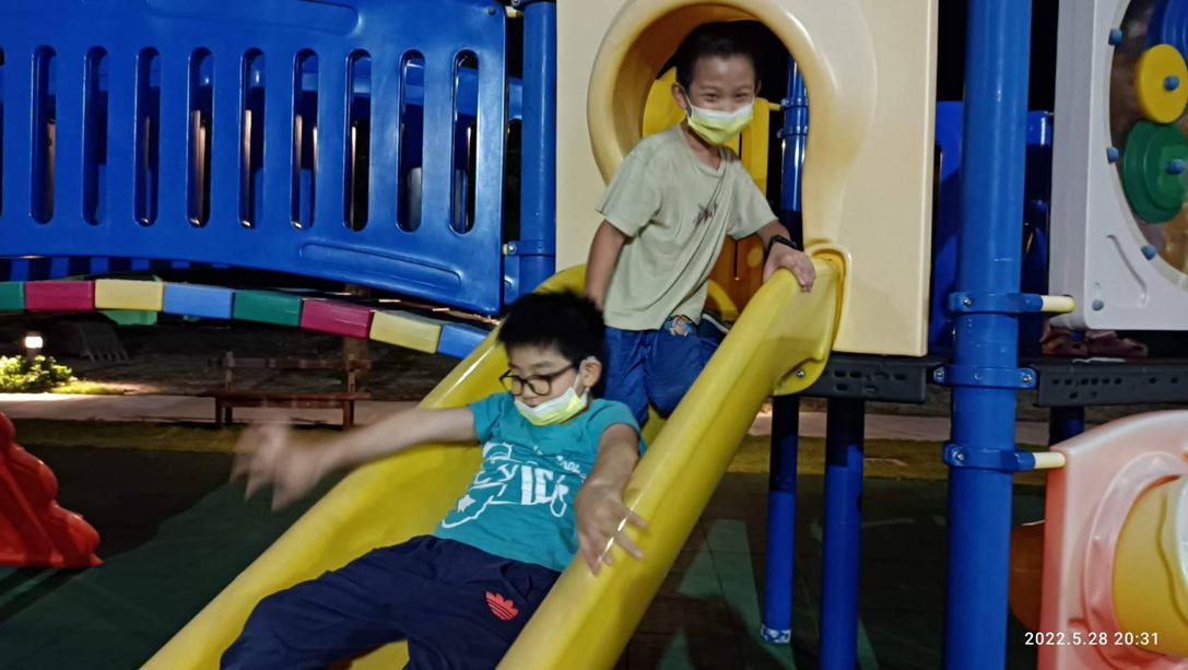 跑步完後的溜滑梯時間,就是泉泉和弟弟兩人最快樂的時光。