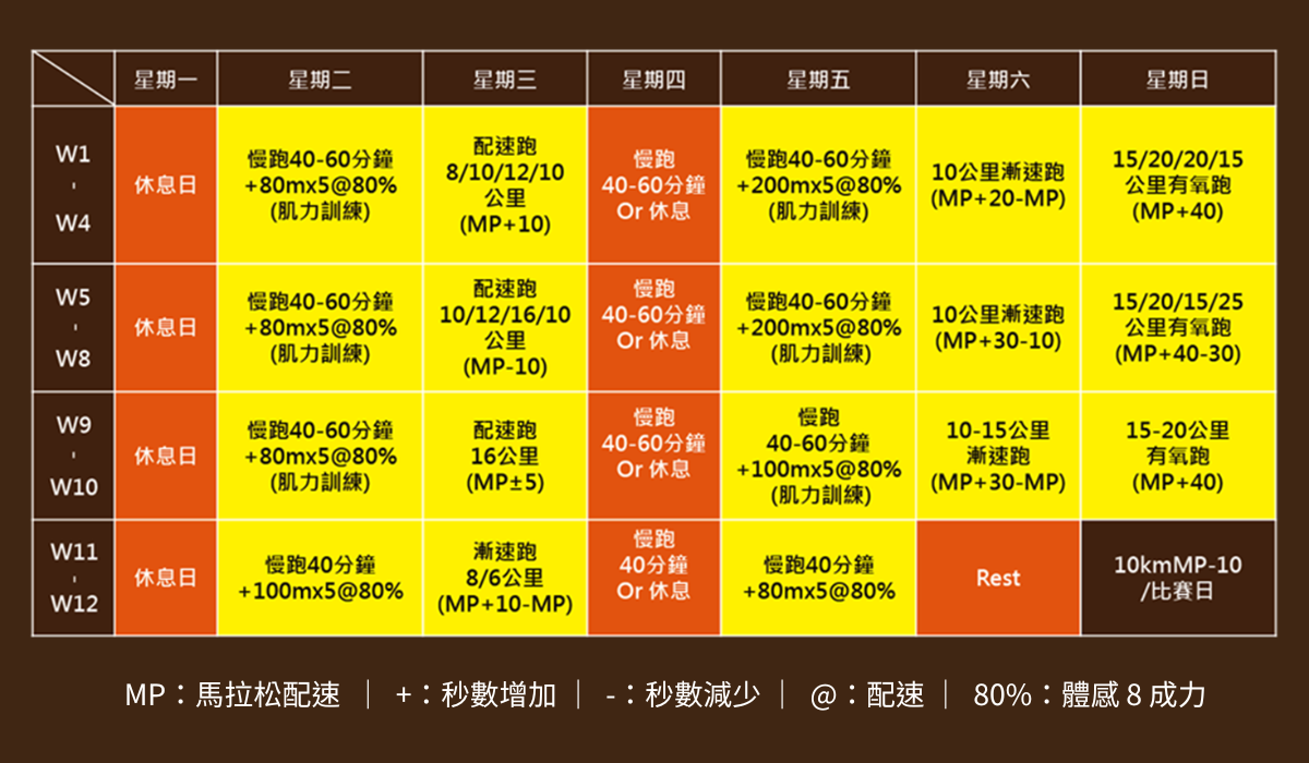 初馬訓練首重有氧耐力的基礎打底,藉由乳酸閾值跑與攝氧能力跑來突破潛能,賽前則可運用賽事配速跑與強化配速跑來適應強度。李翰暄為初馬跑者設計約 5 小時完賽的訓練課表,且以享受初馬、無痛完賽為最高訴求。