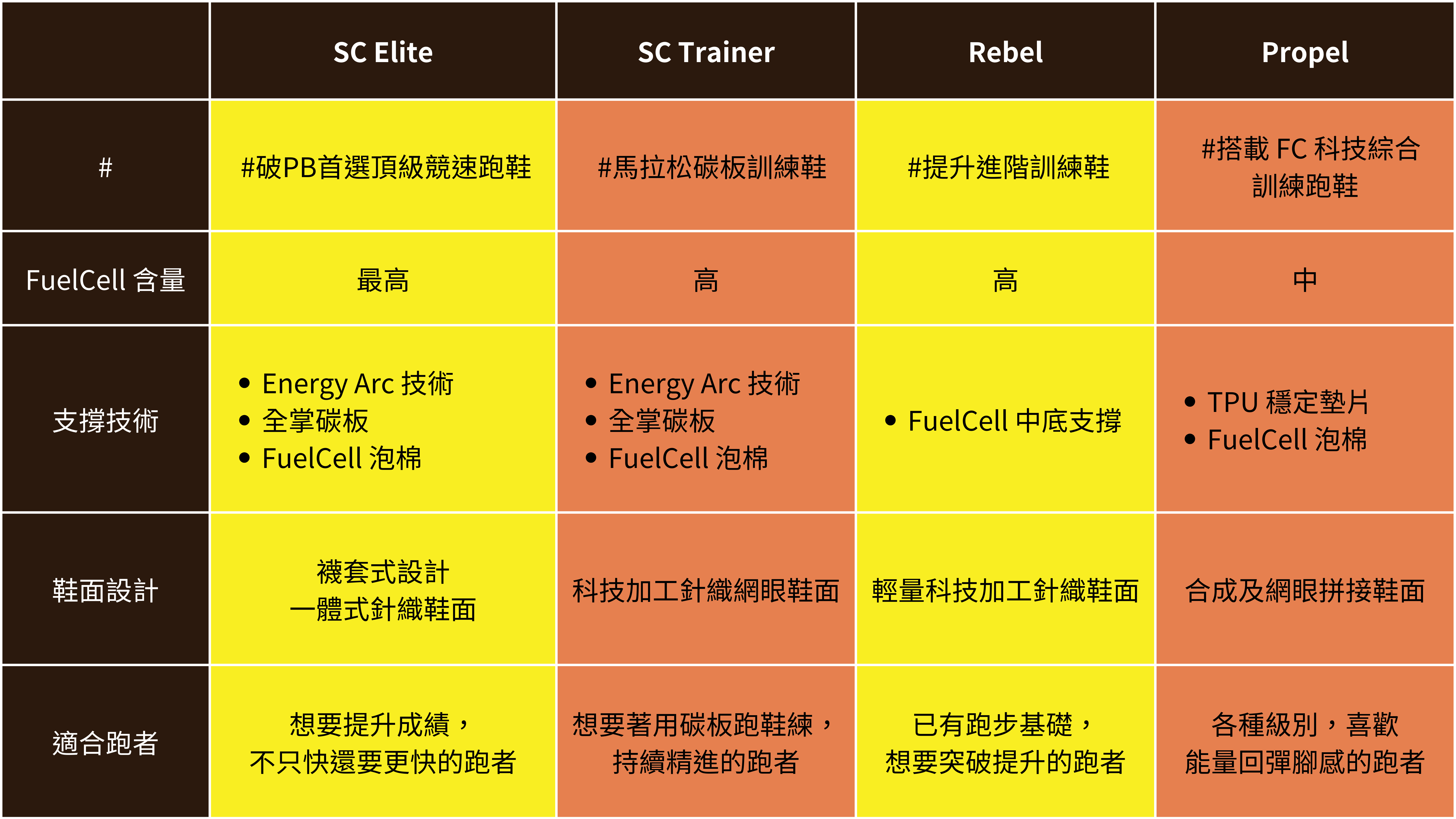 首先,若是 8~10K 的輕鬆跑,推薦著用 Rebel。而 20K 以上則建議選擇 Propel 與 SC Trainer,前者 Propel 非常適合跑快的情境,TPU 板讓能量回饋兼顧穩定性;後者 SC Trainer 因 FuelCell 含量較高緩震吸收較佳,更適合跑慢或訓練時間較長的情況,且搭載碳纖維板也讓跑者可作為 SC Elite 前哨站,碳板訓練鞋首選。最後,SC Elite 則完全是為了追求表現而登場的競賽碳板鞋款,專為速度而生享受極速快感的滋味。