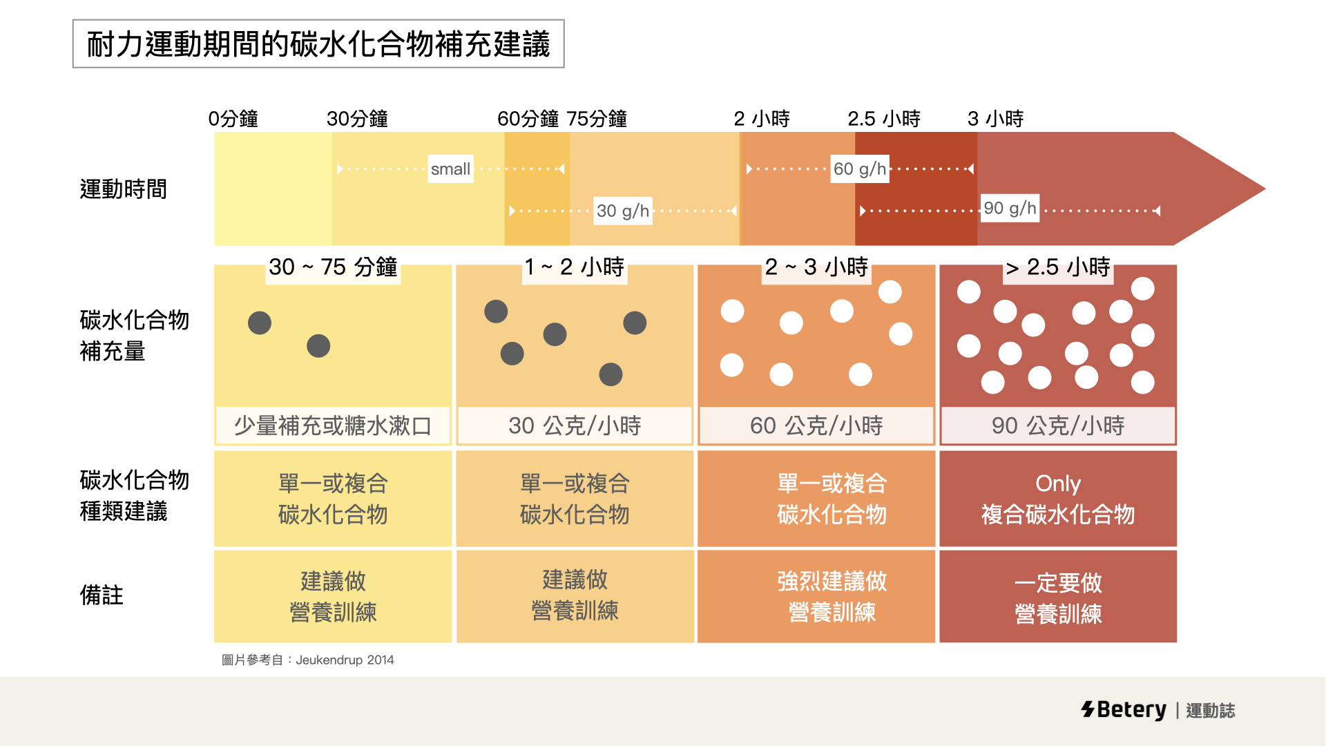 請你再往上看「耐力運動期間的碳水化合物補給建議」,相信你會有原來如此的想法。