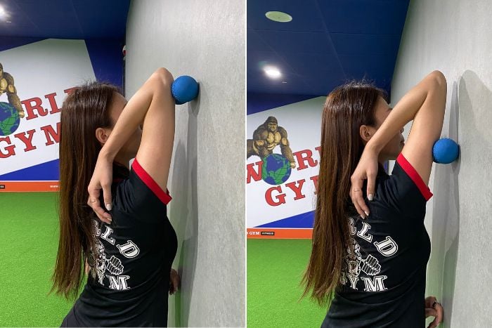 上臂又緊又痠痛時可以放鬆三頭肌加速恢復,將手舉到耳朵旁,在牆上放一顆按摩球,接著往上和往下滾動來放鬆三頭肌,也可以左右旋轉手臂來放鬆長頭、短頭和內側頭。