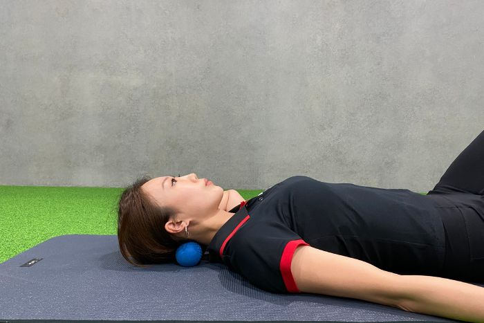 平躺在瑜珈墊上,將花生球置於頭部下方,定位到痠痛的區域,最初可能會感受到枕下肌肉的緊繃感,但隨著呼吸的起伏,肌肉和筋膜的緊繃感漸釋放。