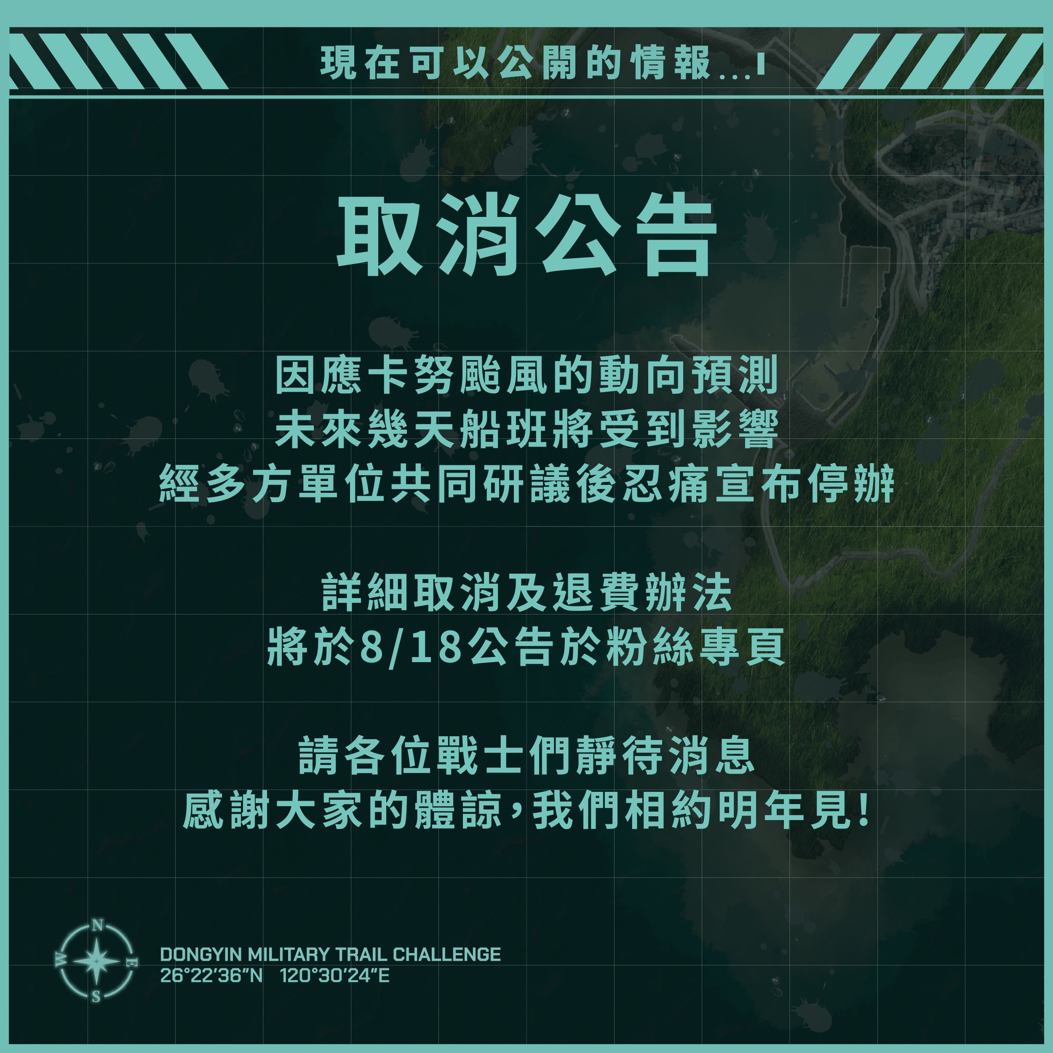 2023 東引軍事越野障礙賽,因卡努颱風攪局,宣布停辦。因受颱風卡努影響北部海面及航運交通,原訂於 8 月 4 日至 8 月 6 日舉辦的 2023 東引軍事越野障礙賽,經再三評估並納入多方意見後,宣布取消辦理,相關退費機制及各項活動之處理辦法,主辦單位將持續研擬更加完善的措施,並於 8 月 18 日前公告於「東引軍事越野障礙賽粉絲專頁」。