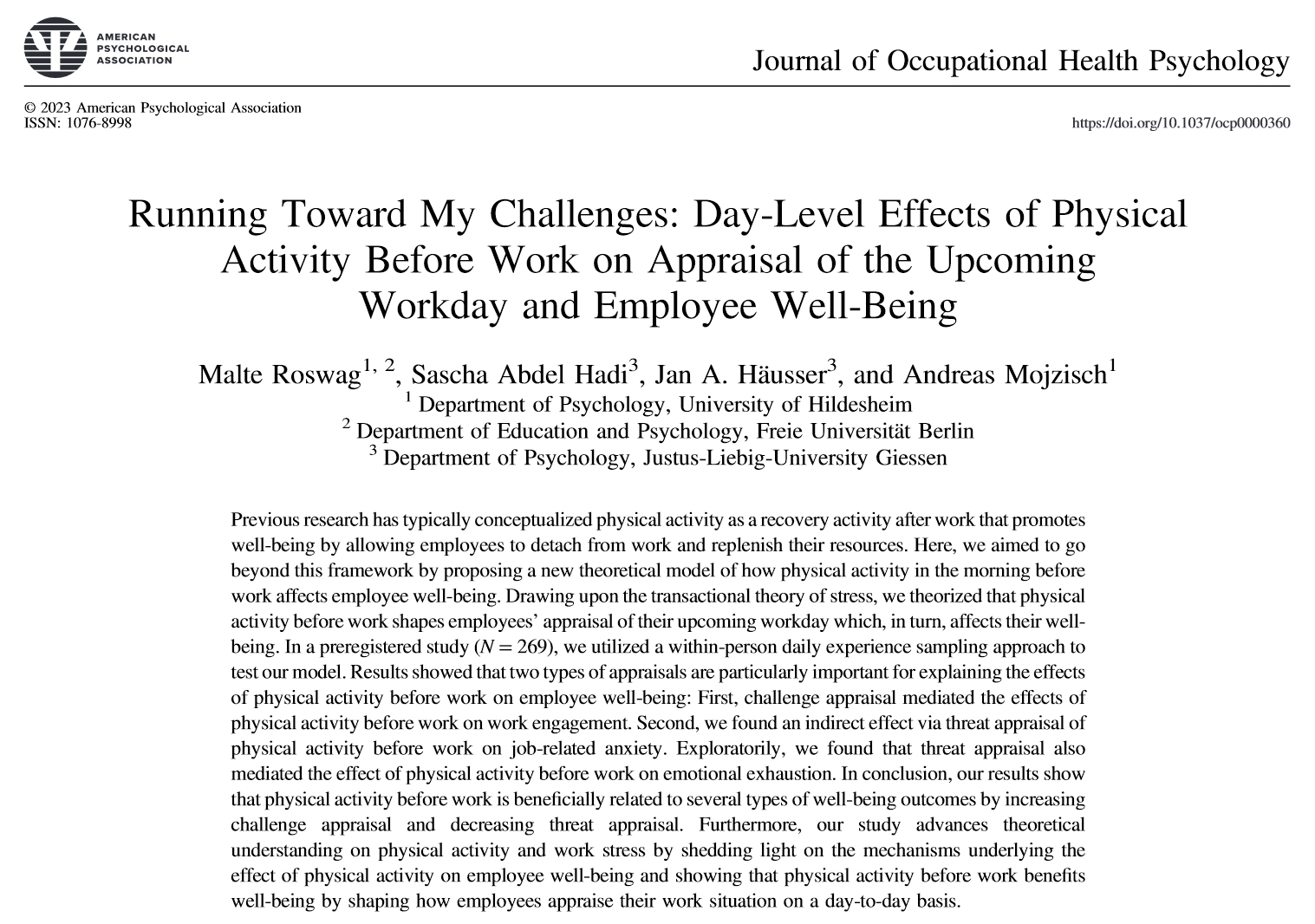 研究人員的假設是,「工作前身體得到鍛鍊,能夠提升挑戰評估,降低工作阻礙,進而提高工作投入,減少情緒疲勞和工作相關的擔憂」。
