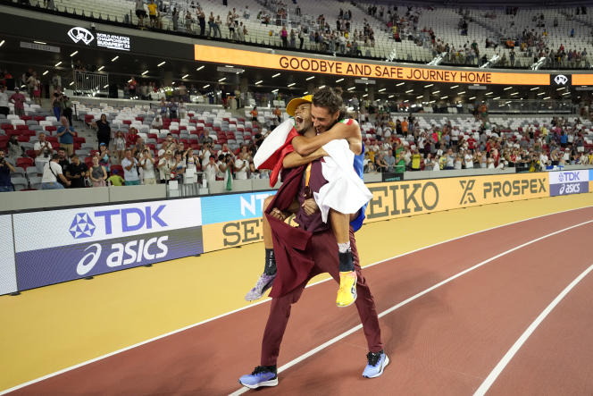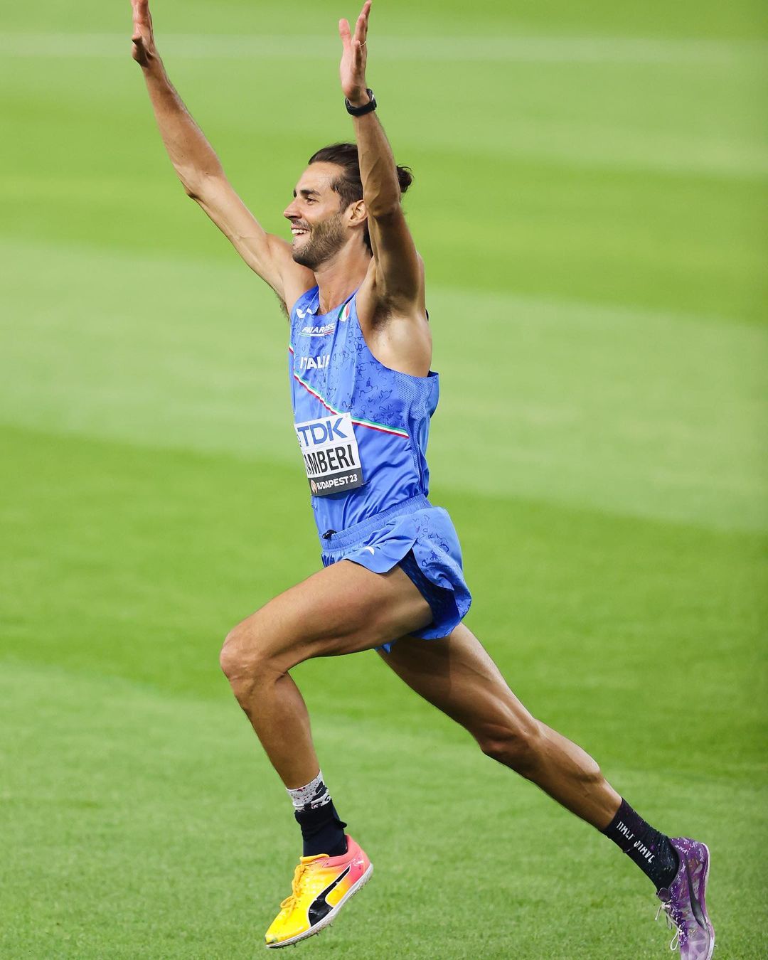 然而這還不是結束,Tamberi 開心的跳上他的對手、好朋友同時也是銅牌得主的 Barshim 背上,雙手緊緊抱著他, Barshim 也高興地背著 Tamberi 在田徑場上走著歡慶。結果下一刻,Tamberi 竟走到 3000m 障礙的水坑前,脫下了釘鞋,和剛完賽的 3000m 障礙金牌選手 Soufiane El Bakkali 以及銅牌的 Abraham Kibiwot 一起跳進水坑,用身體濺起了水花,玩的不亦樂乎,因為摘下世錦賽金牌這一刻對 Tamberi 來說真的是非常的深刻。