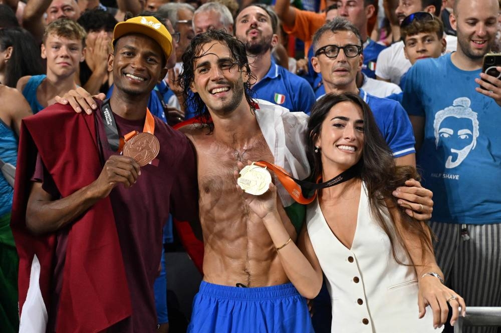 左起:Barshim 、Tamberi 、Tamberi 老婆。圖/Qatar Tribune