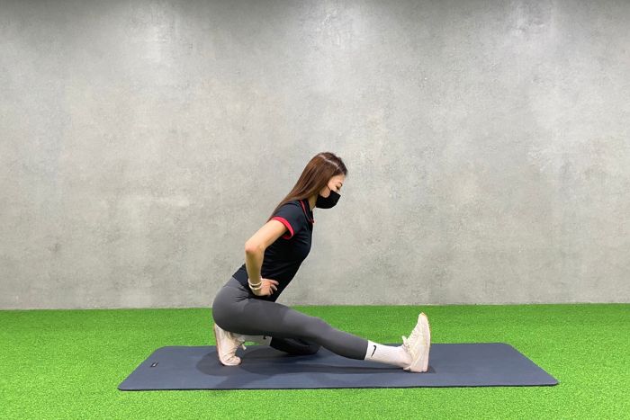 單腳跪坐在瑜珈墊上,另一腳伸直,腳跟著地,骨盆、脊柱保持中立,輕輕向前傾(足背屈可連帶伸展小腿)。