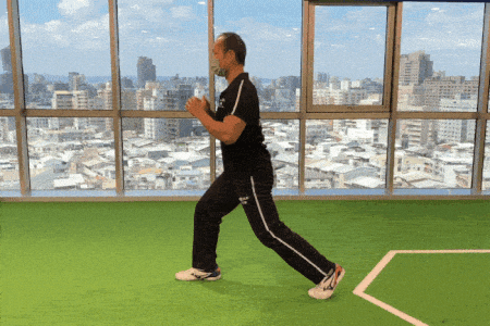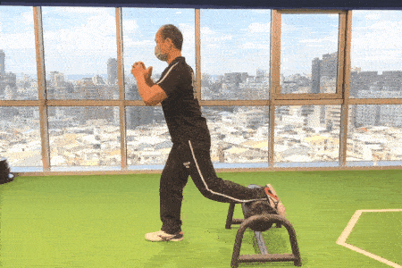 若想要加強股四頭肌的感受度,可以使用單腿蹲舉機或是找一個高度適合的台階讓後腳墊高,使身體 80~90% 的重量都集中在前腳上,而且行程拉更長,所以做起來會更加吃力。