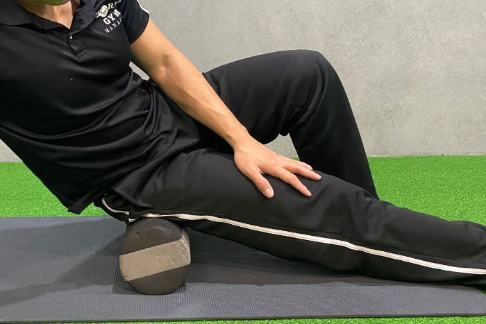 前面有提到,肌肉緊繃也是導致髂脛束症候群的原因之一,因此可以藉由放鬆臀部肌群來改善。利用滾筒來增加筋膜的彈性,還能提升跑步效益喔!