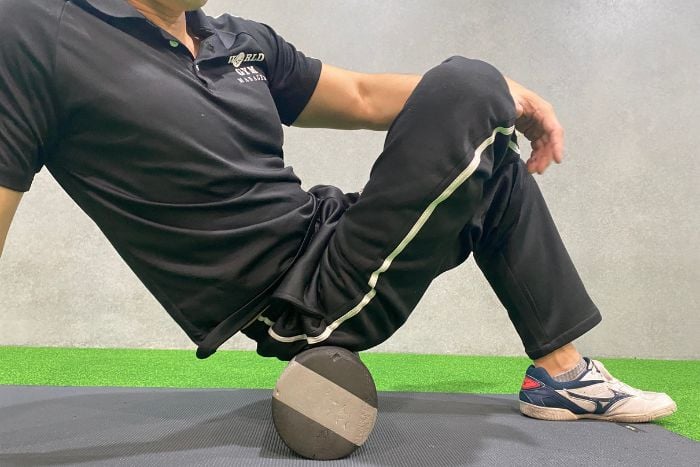側身將滾筒放在我們的髖關節外側來回的滾動,就可以放鬆到臀中肌。