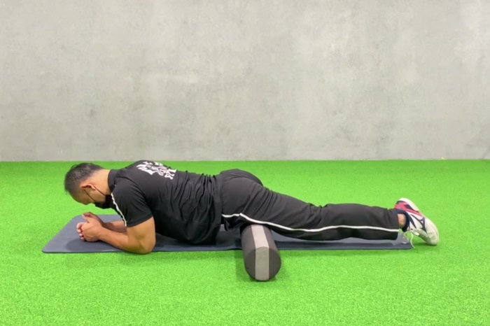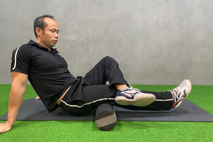 把臀部放到滾筒上,並把放鬆腳翹起來,接著來回滾動就即可。