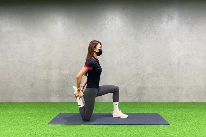 採高跪姿,前腳踩穩地面,骨盆維持中立位或微帶後傾,手握住伸展邊的腳踝,再依個人可接受程度讓腳靠近臀部,張力大概 6~7 分。