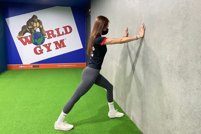 將雙手放在牆上,雙腳採前後站姿,手掌貼緊牆壁,前腳屈膝,後腳伸直且腳尖對齊膝蓋方向。