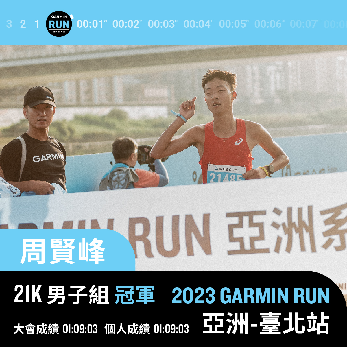 周賢峰於半馬男子組以 1:09:03 封王。圖/Garmin Run Club Taiwan