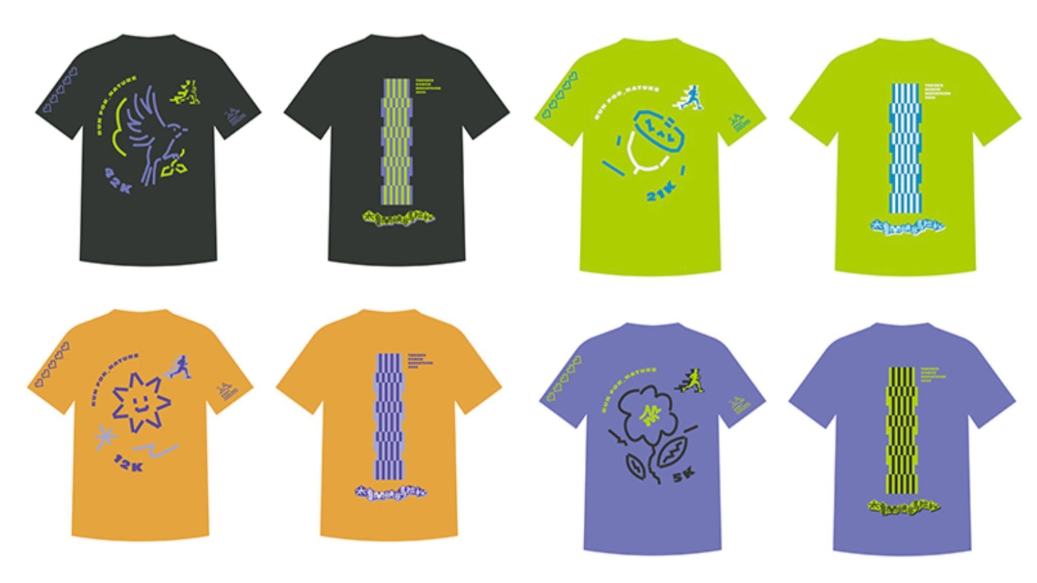 今年完賽衣同樣都採用回收寶特瓶製成,每一件完賽衣都使用 5 個寶特瓶回收製成,共計使用 7 萬支寶特瓶製作。以自然為靈感結合大會「Run For Nature」與在地元素理念,傳遞大自然永續不滅的精神!