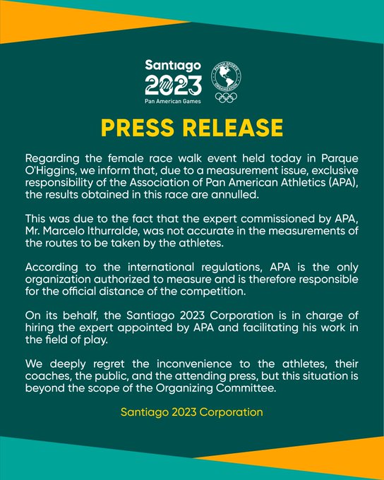 然而對於比賽距離測量錯誤,2023 泛美運動會主辦方有話說,他將責任歸咎於泛美田徑協會,他們在聲明稿中解釋:「泛美田徑協會是唯一被授權進行測量的組織,因此對比賽的官方距離負有責任,我們對於運動員、教練、觀眾、參與記者的不便深感遺憾,但這種情況不能完全歸咎於主辦單位。」