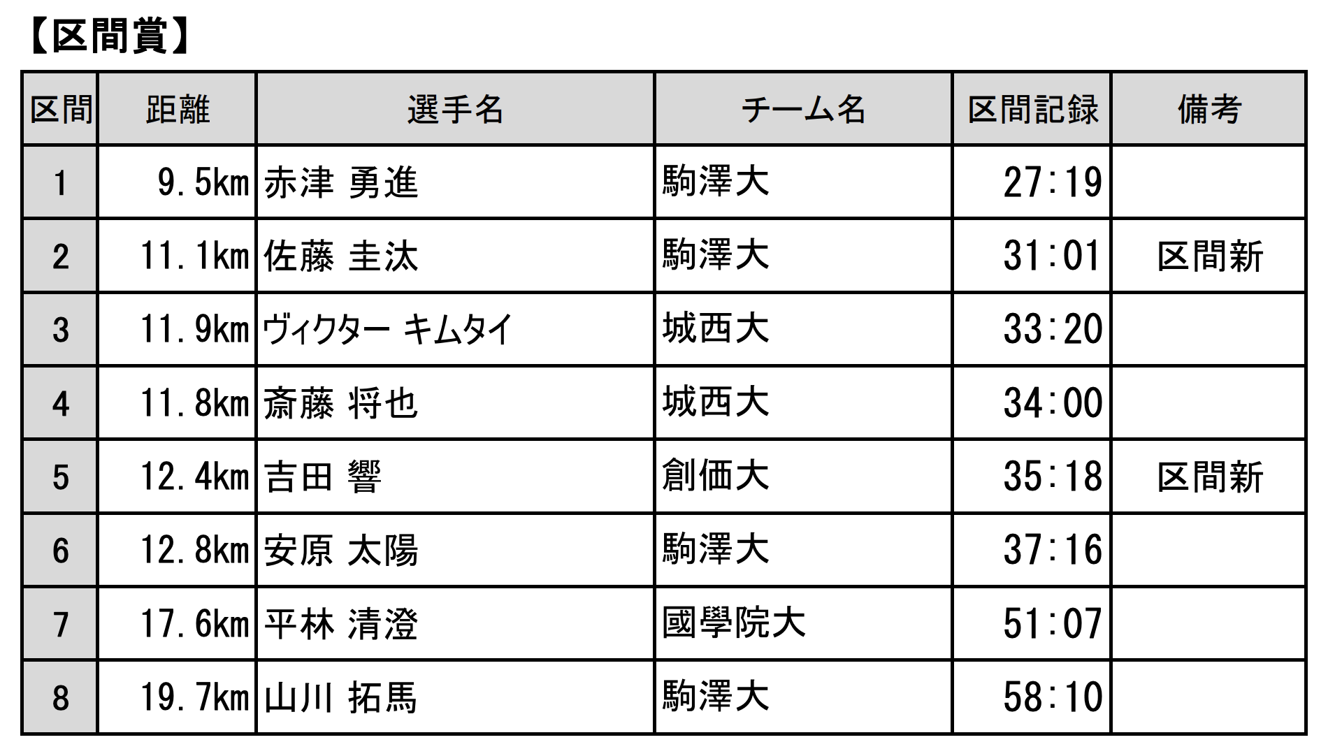 駒澤大學拿下一、二、六、八區的區間賞。圖/全日本大學驛傳官網