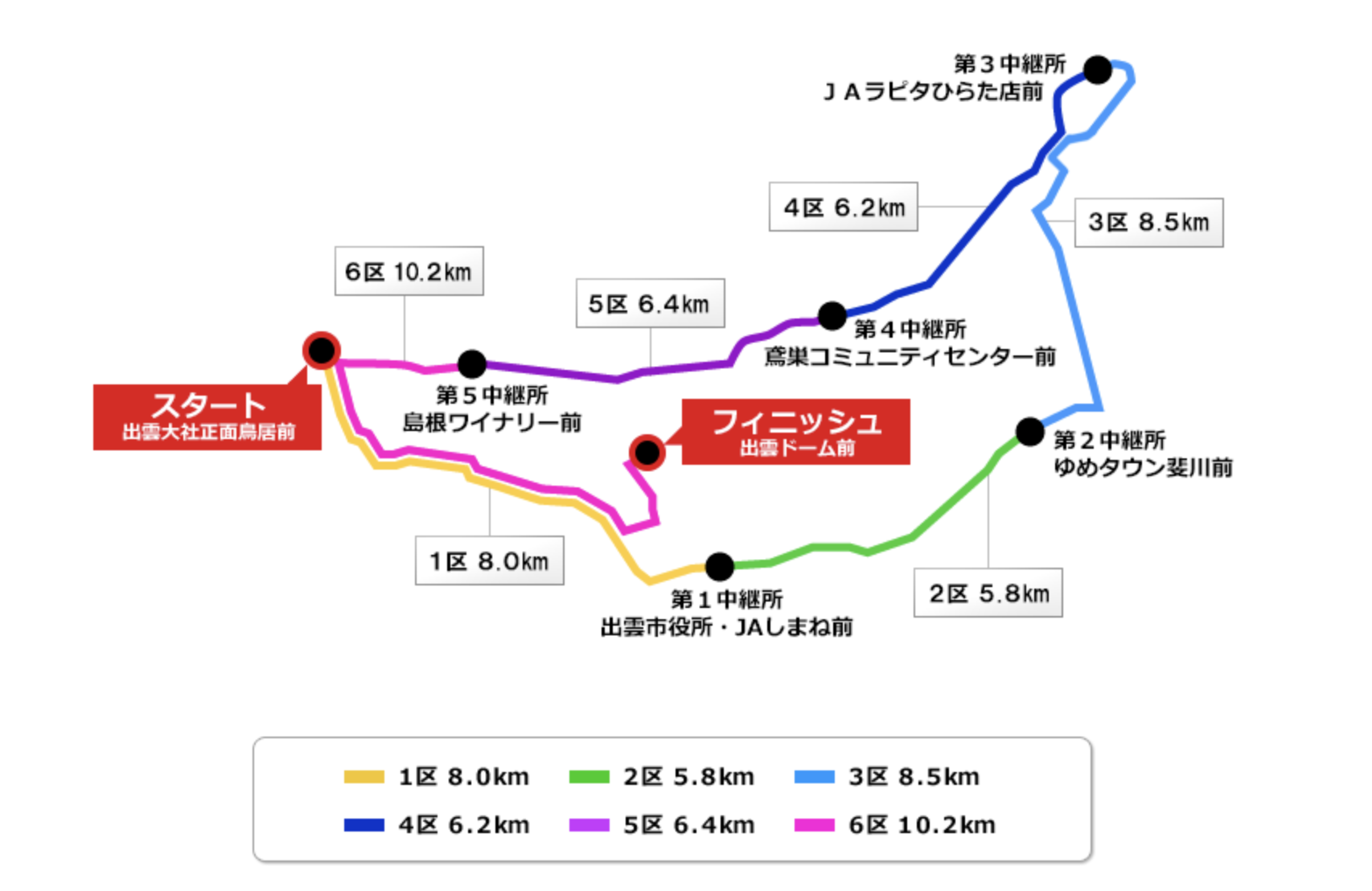 出雲驛傳從出雲大社啟程共 45.1 公里,是三大接力賽中最短的一場,也是排名速度變化最快的比賽,由六位選手接力完成,而且對外國學生運動員的人數也沒有限制(箱根驛傳和全日本大學驛傳有參加人數限制為2人以及1人以下的規定),而這場賽事也是各校迎接新生磨合後參加的首場大賽,為接下來的賽事暖身。
