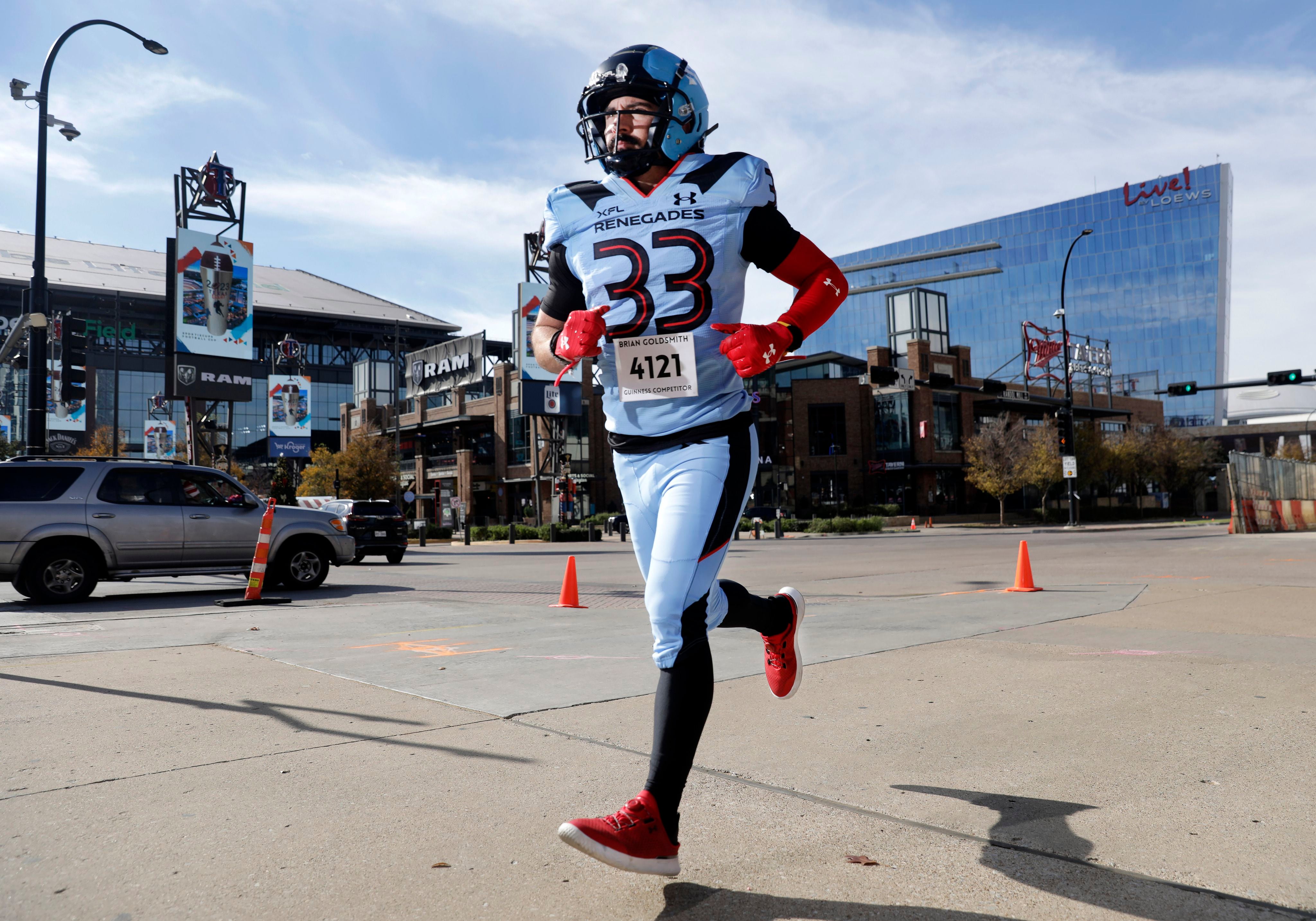 根據當地媒體報導,起初 Goldsmith 的目標是在達拉斯馬拉松上爭取波士頓的參賽資格,然而,在一位同事的建議下,他突發奇想,穿著球衣參賽實在太過於普通了,為何不穿上整套裝備,挑戰金氏世界紀錄呢?
