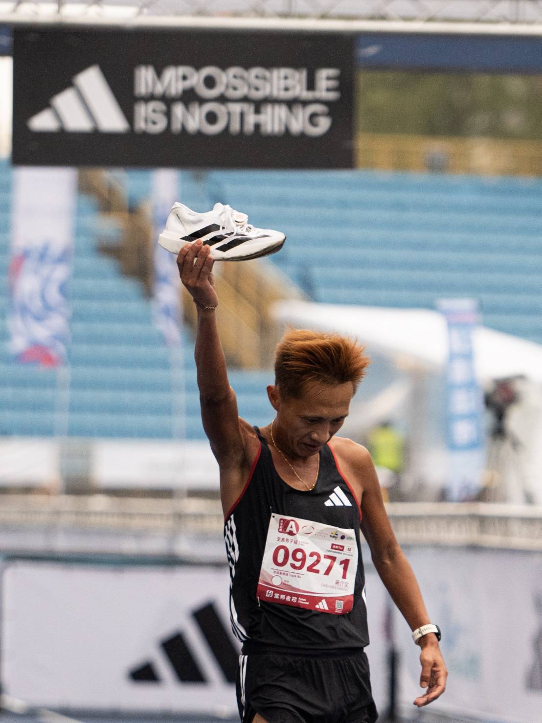蔣哥跑完向大家展示 adidas 最新神鞋 adios Pro Evo1。圖/臺北馬拉松官方