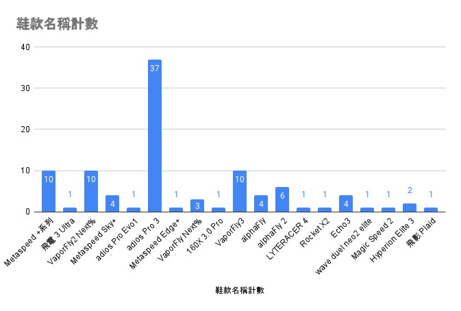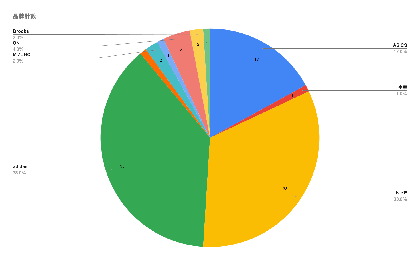 另外值得一提的是,本次共有 3 雙中國品牌跑鞋,分別是喬丹、李寧與特步同樣殺進 Top100 當中,中國跑鞋品牌逐漸崛起,假如放到 Top1000 是否會有更明顯的成長呢,值得我們將數據擴大至 1000 雙再回頭來看看,另外,雖然 New Balance 也相當積極,但似乎在近期的大賽上無法擠進 Top100 之中,或許可以看看在 1000 之中的佔比,能否提升。
