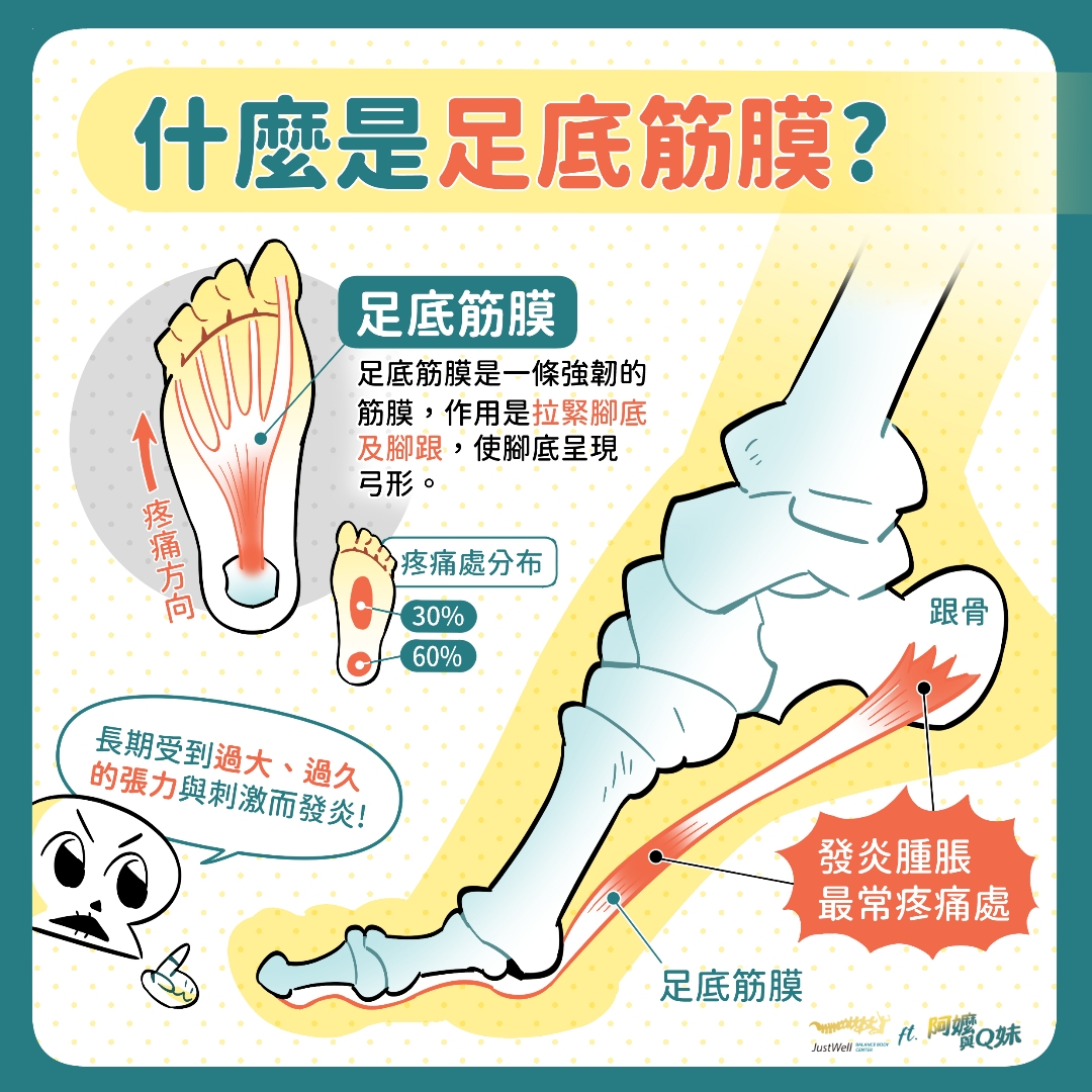 足底筋膜位於腳底,從腳跟一路延伸到腳趾頭,向弓弦一樣,負責維持足弓、腳踝的穩定度,在行走與跑跳中,幫助吸震及緩衝,是非常有彈性的組織。