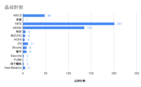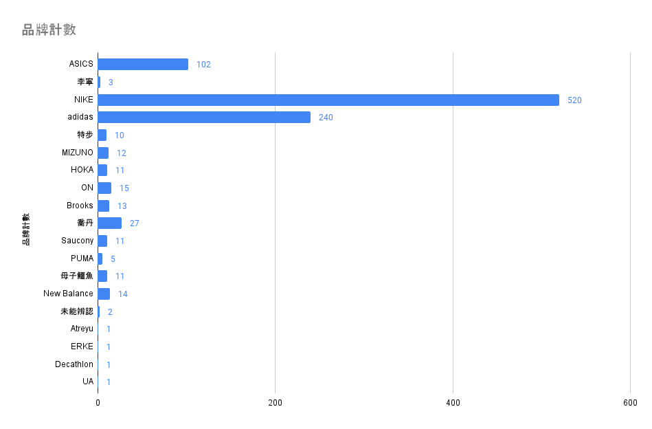 以上是本次臺北馬拉松的一千雙鞋款統計,為了防止小編老眼昏花、角度辨識等各種因素影響,一樣會留下表單讓大家來留下備註,一同協力將這份數據更完整更為精確!也順便救救小編的雙眼(跪謝