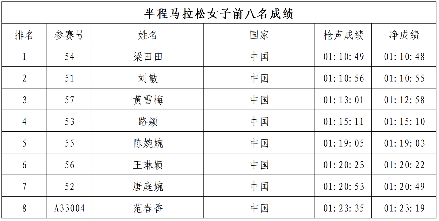 女子選手方面,梁田田以 1:10:49 的成績獲得冠軍,創下今年中國馬拉松女子半馬最好的成績,劉敏以 1:11:01 拿下亞軍,中國馬拉松業餘一姐黃雪梅則是以 1:12:58 的 PB 成績收穫季軍。
