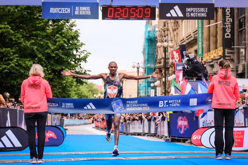 2023 年肯亞選手 Alexander Mutiso 以 2:05:09 的成績刷新布拉格馬拉松賽道紀錄。圖/AIMS