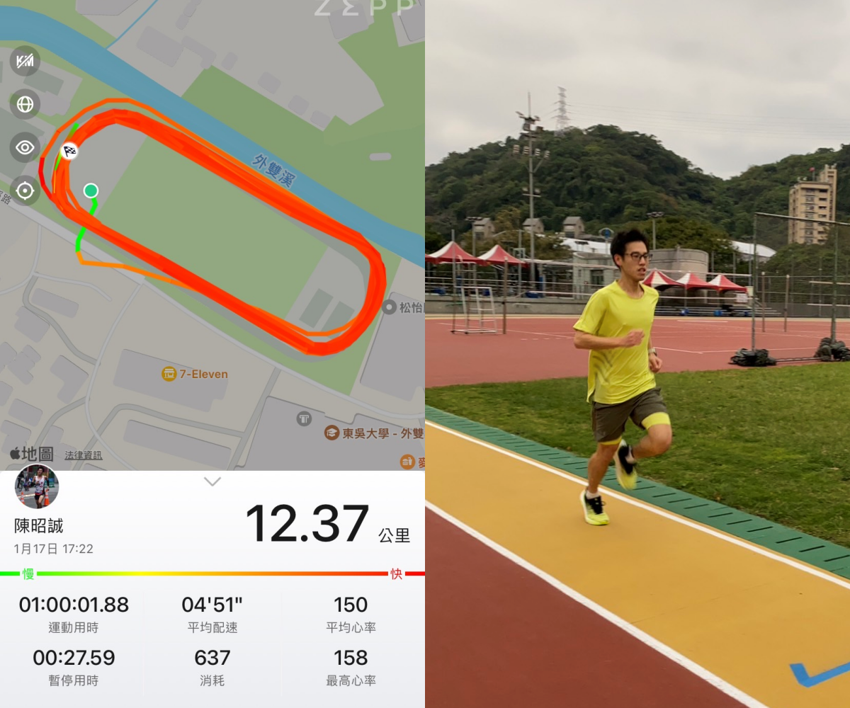 昭誠則在田徑場的 PU 跑道內則進行 12 公里慢跑,過程中可明顯感受到 PU 跑道的腳感更加柔軟且更 Q 彈,在跑動中逐漸感受到推進與滾動感,且在訓練後段仍有著不錯的中底回饋。