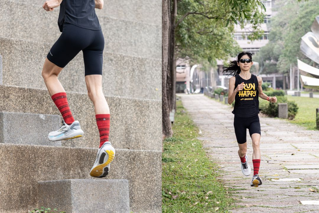 討論到階梯和坡地訓練的難度時,這類練習對於提升跑者的腿部肌力和敏捷度極為有益。如果能適度地將這些訓練,融入日常訓練計畫中,不僅能夠增強肌力,還能提高不同肌肉群的協調效率。此外,大多數路跑者的日常訓練場所,通常選擇在馬路旁的紅磚區域或公園,這些地方的路面不平整且多樣化。在這種情況下,BROOKS GLYCERIN GTS 21憑藉其強健的大底抓地力、和緊密的鞋身包覆設計,在面對坡度變化和腳步轉換時,仍能夠提供充足的穩定性和緩震保護。