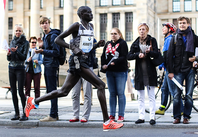 基普魯托·基梅托 (Dennis Kimetto) 在 2014 柏林馬拉松穿著 ADIZERO ADIOS BOOST 2 薄底跑鞋打破世界紀錄 2 小時 2 分 57 秒