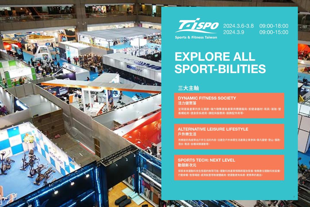 由外貿協會所主辦的 2024 台灣國際運動及健身展將於 3 月 6 日 至 9 日在台北南港展覽 2 館舉行,為期 4 天的展覽將圍繞著以「活力健聚落」、「戶外樂生活」、「動競新次元」三大主軸展開,聚焦在推廣運動的多元性,以展現出戶外運動及休閒運動不同面貌。