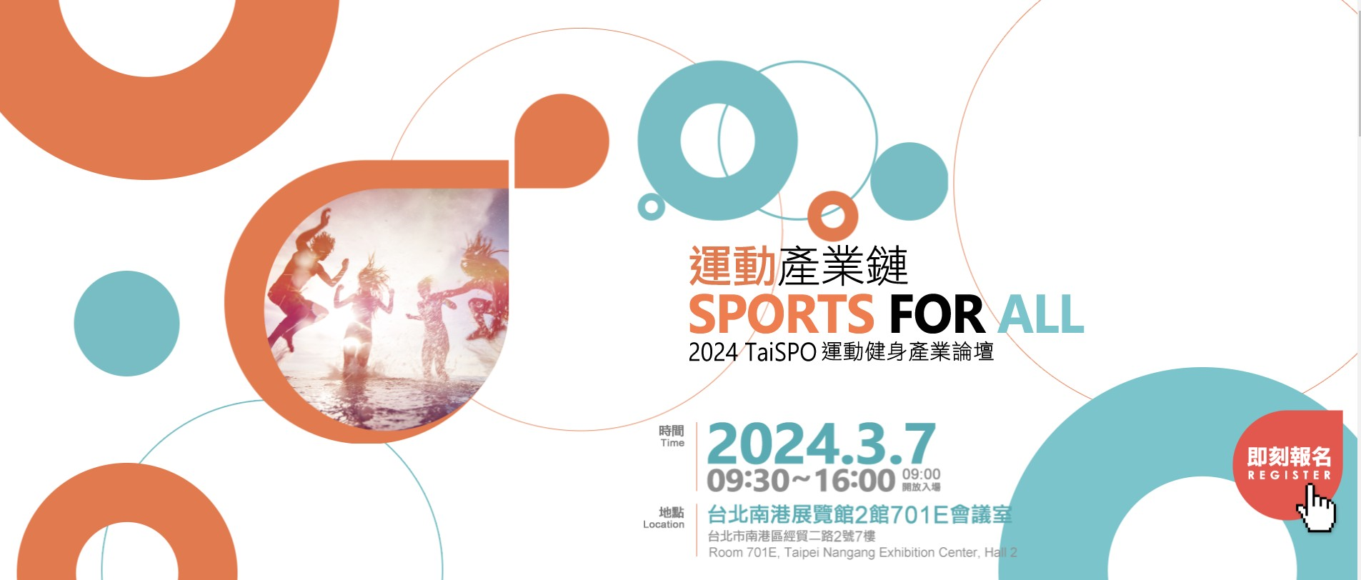 另外,還有 2024 TaiSPO 運動健身產業論壇,邀請各運動領域專家學者們來分享,從運動情境、運動器材、運動感測科技到商模新趨勢,共創全新運動產業鏈的大運動時代。無論您是室內運動愛好者、戶外咖、相關領域專業人士,台灣國際運動及健身展都將是您不容錯過的盛會,趕緊和全世界一同探索最新的產品與技術,交流分享運動與健康的理念,歡迎業者以名片預登、換證入場。3 月 8、9 號開放一般民眾購票參觀,促進運動與健身產業的繁榮發展吧!更多展覽及活動相關資訊請至 TaiSPO 官網查詢。