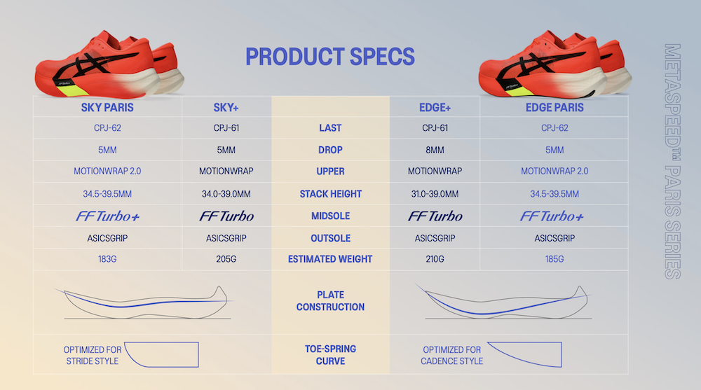 ASICS 在發佈 Sky、Edge 專門針對了兩種不同的跑步風格進行設計,SKY 是為了「步幅型跑者」們設計,意味著他們步幅較長,滯空時間更長;EDGE 則是針對「步頻型跑者」設計,透過提高步頻來增加速度。