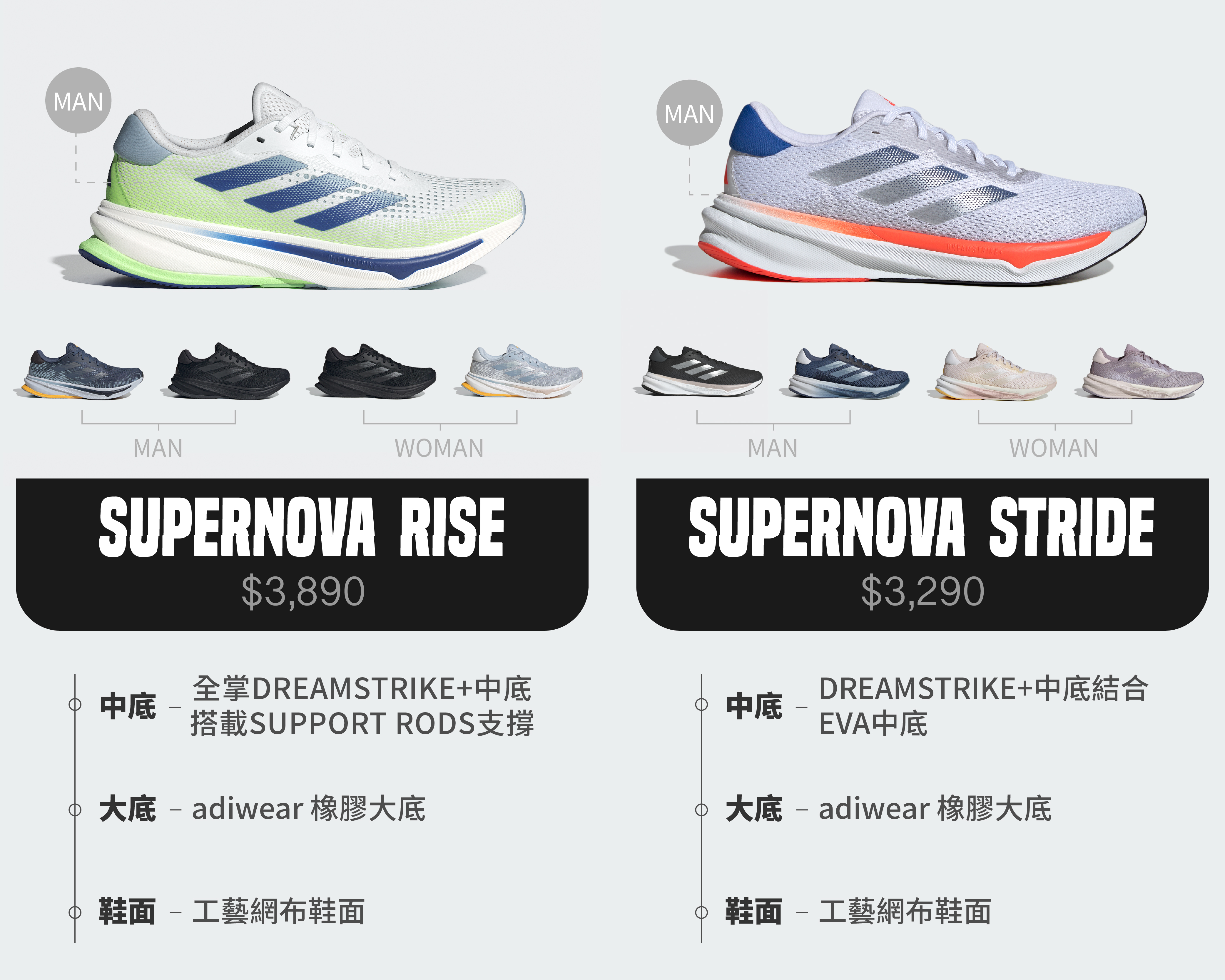 SUPERNOVA RISE 是入門跑鞋首選;SUPERNOVA STRIDE 出色的滾動感,適合追求訓練提升的中階跑者。(照片來源:Daniel)