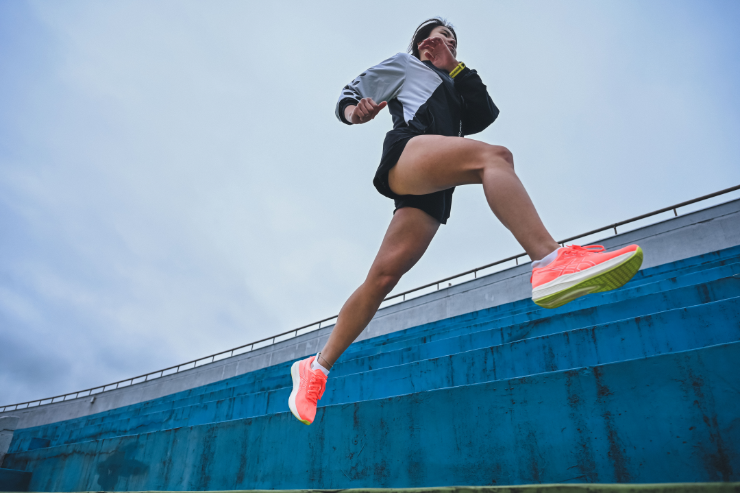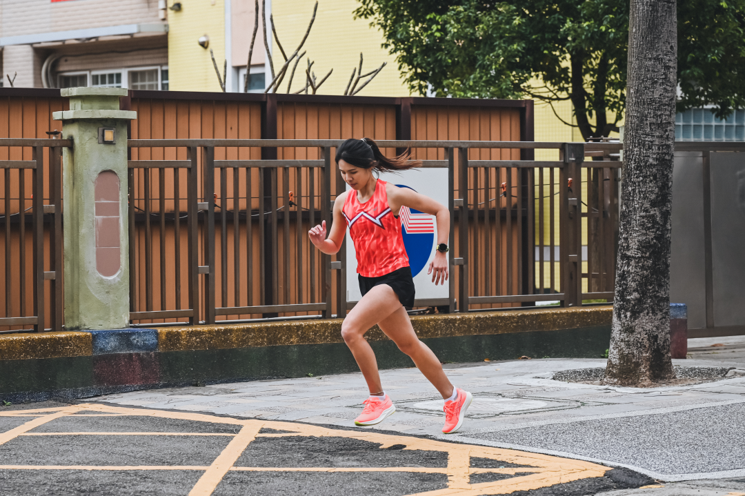 首先,選擇跑者最常吃課表的操場進行實測訓練,因為 PU 跑道本身的彈性和吸震能力都比較好,有些加速度會被吸收掉,但 EVORIDE SPEED 2 舒適且不潰縮的回彈性,和自然推進的節奏感及抓地力,讓跑的當下更省力,並且能輕鬆維持速度;即使沒有碳板,中底的支撐性和滾動式弧形的鞋底設計也會一直提供剛剛好的推進力,相比穿競速鞋款,需要耗費較多肌肉來發力,EVORIDE SPEED 2 真的比較輕鬆就能自然達到換步的動作