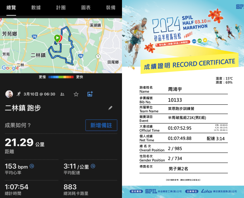 終於等到 METASPEED SKY PARIS 在台灣公開上市,周末迫不及待穿上它參加賽事,來一個隨堂抽考,考驗鞋子在戰場上的表現。因為當天天氣陰涼,賽事路線起伏不大,跑起來很舒適,可以感受到穩定的回彈感,即使後半段疲憊感湧上時,雙腳依然能藉由碳板的回饋,順利帶起輕巧的鞋子,整體每公里均速 3 分 11 秒,用時共計 67 分 52 秒,拿下總排第二。