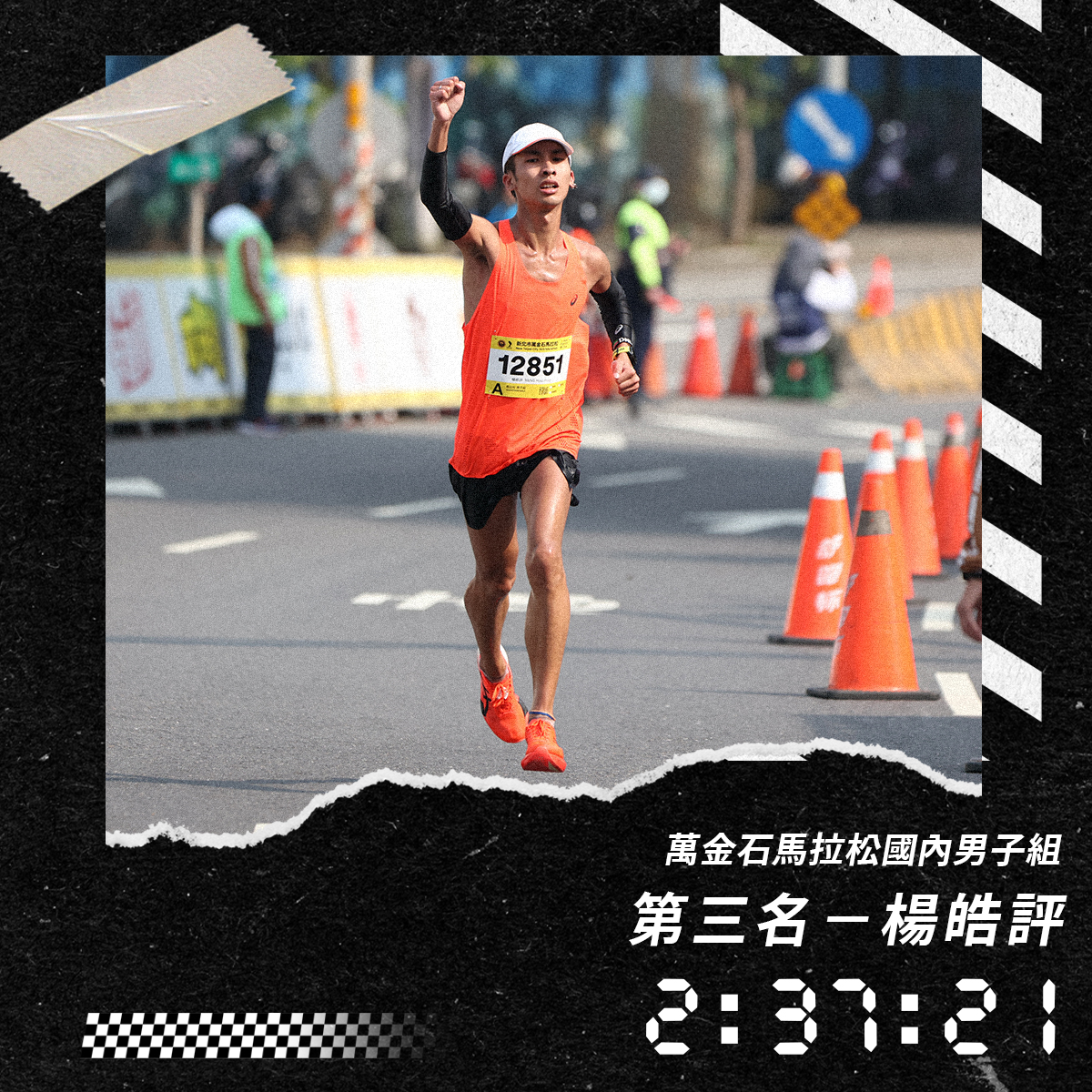 賽事進到 30 公里時,皓評的前大腿已經有點痠痛,而接下來又即將面對魔王「麥當勞坡」,他再次跟華凡喊話:「我們可以的!再撐一下,這個撐完就沒了!」挺過麥當勞坡後,一路伴隨他的華凡開始加速朝終點奔去,皓評知道接下來的路程要獨自堅強了,儘管小腿已經快抽筋,他仍然趕緊調整跑姿,邁開步伐向前推進。比賽最終教練周庭印以 02:24:43 拿下國內男子冠軍,黃華凡以 02:36:20 摘下國內男總二,楊皓評則以 02:37:21 順利奪下國內男子第三。