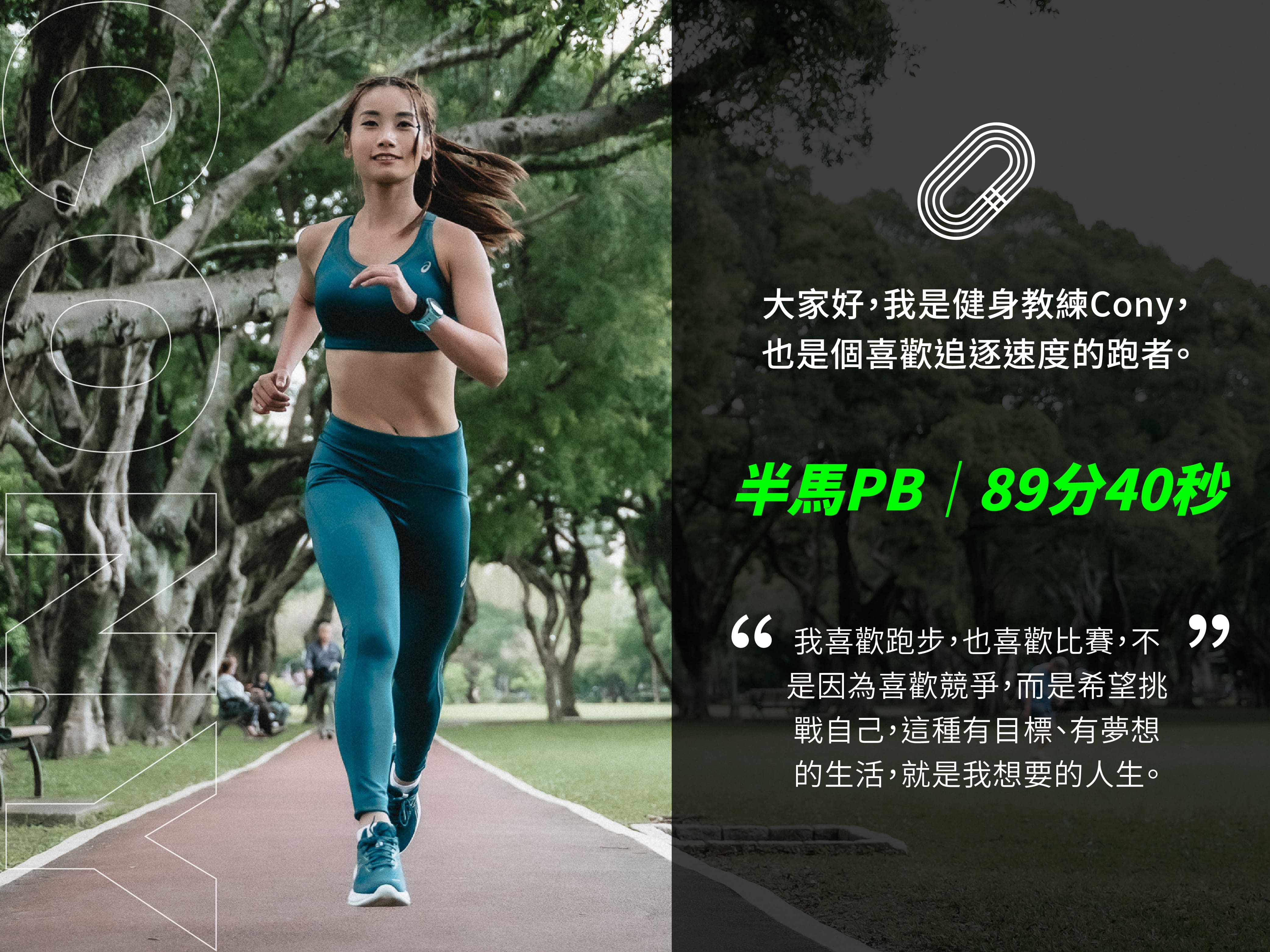大家好,我是健身教練兼跑者 Cony。從去年開始接受系統訓練至今,不僅將身材保持在理想狀態,更在跑步這條路上持續突破自我。在今年渣打馬跑出 PB,除了感動之外,也讓我體會到只要不斷努力,定能邁向更高目標。展望 2025 年,將鎖定海外全馬挑戰,期盼在這條跑馬的路上持續成就自己!