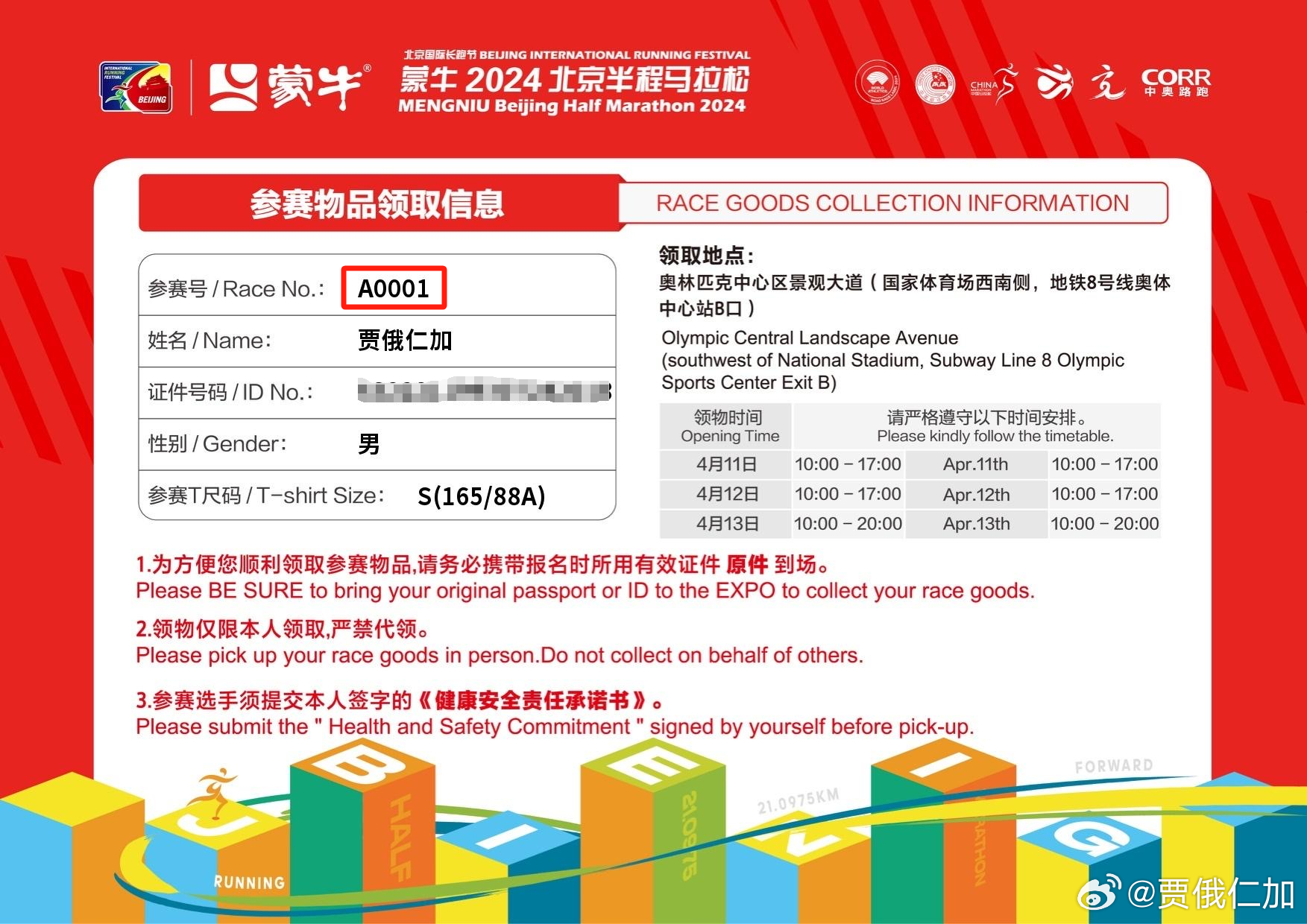 賈俄仁加曬出賽前通知,確信已有參賽資訊並配有參賽號碼。(圖片來源:賈俄仁加微博)