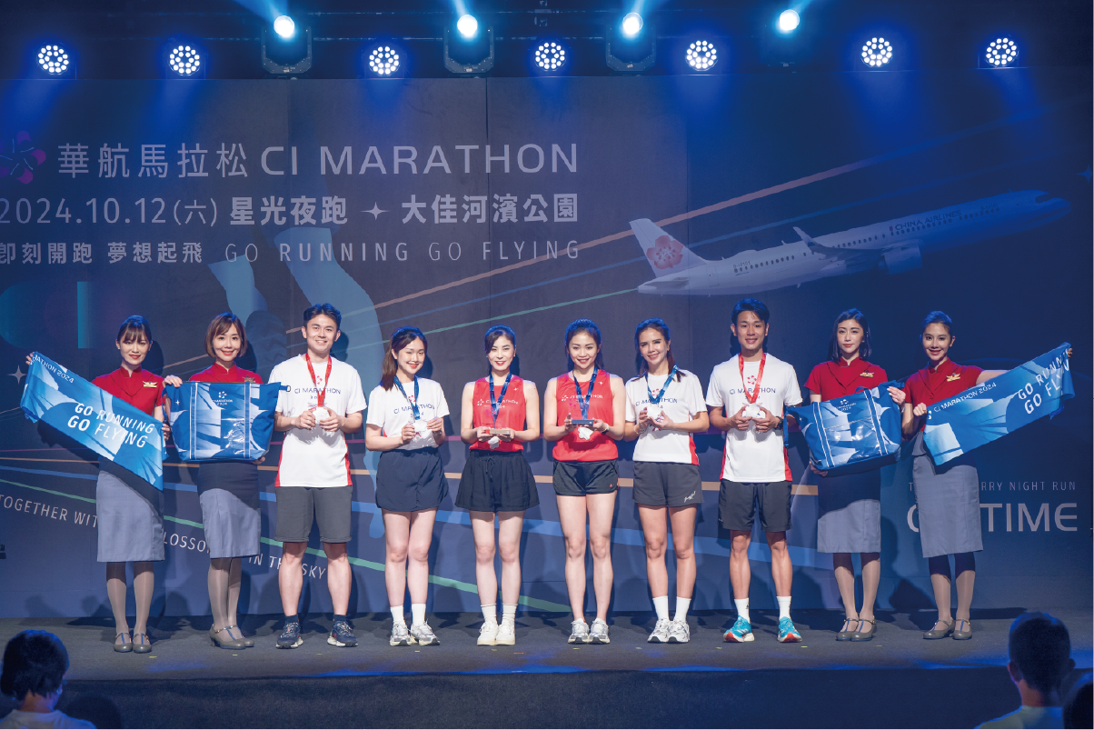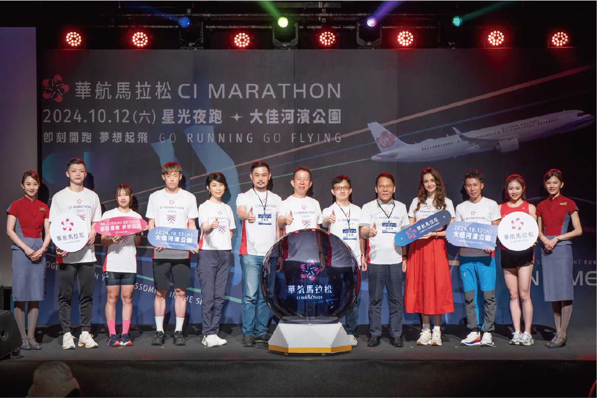 華航為響應世界地球日,特別宣布這場馬拉松賽事的開跑,並由華航資深副總經理陳奕傑與交通部觀光署國際組組長黃易成、臺北市政府觀傳局局長王秋冬及體育局局長王泓翔共同主持啟動儀式。華航贊助的各領域體育好手也到場支持,包括極地超馬好手陳彥博、瑞星韻律體操協會創辦人瑞莎、體壇新秀羽球冠軍「左手重砲」林俊易與短道競速滑冰金牌「滑冰精靈」黃芊華,以及職籃桃園璞園領航猿球員李家慷,為華航活動站台並推廣運動生活。2024 華航馬拉松邀請海內外跑者及喜愛運動的民眾共襄盛舉,即刻開跑,夢想起飛,Go running Go flying。