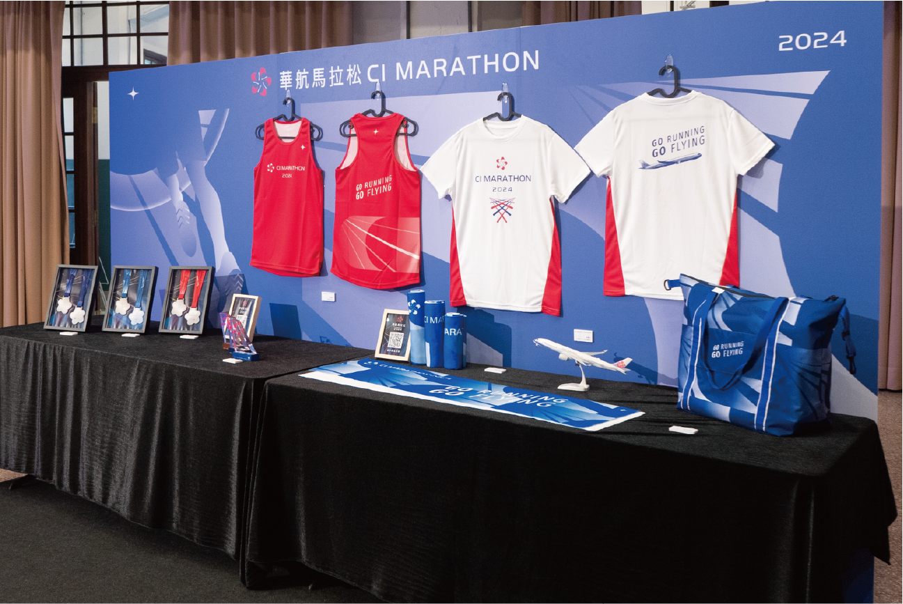 華航員工代表及空服員展示賽事周邊商品,包含獎盃、獎牌、毛巾、賽服及旅行袋等,讓跑者深刻體驗華航對永續運動的承諾。(圖片來源:中華航空)